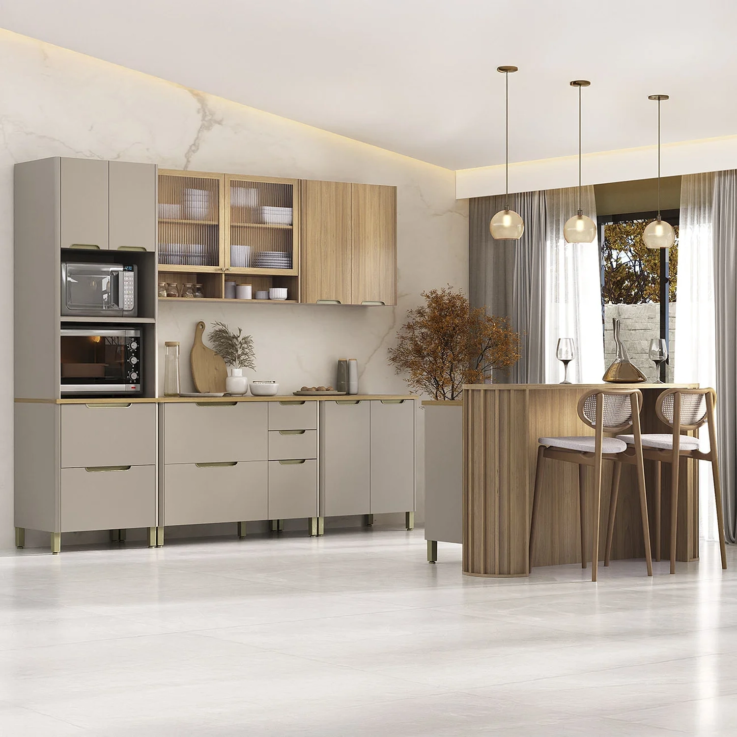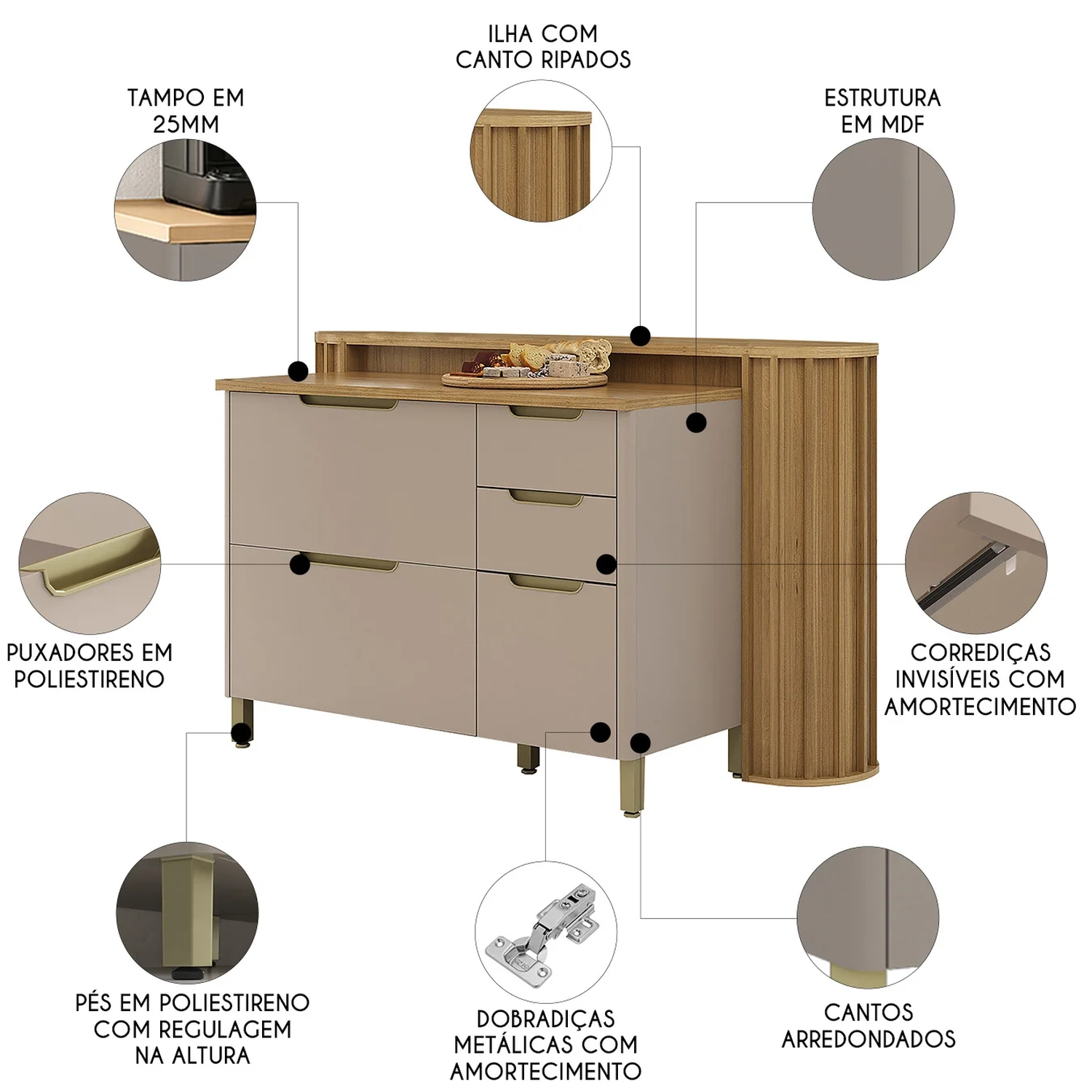 Os Balcões possuem portas com dobradiças metálicas e gavetas com corrediças invisíveis e amortecimento. A Bancada para Ilha traz detalhes ripados e cantos arredondados. Todos os tampos, incluindo balcões e ilha, são em MDF de 25mm, ideais para preparo e apoio.