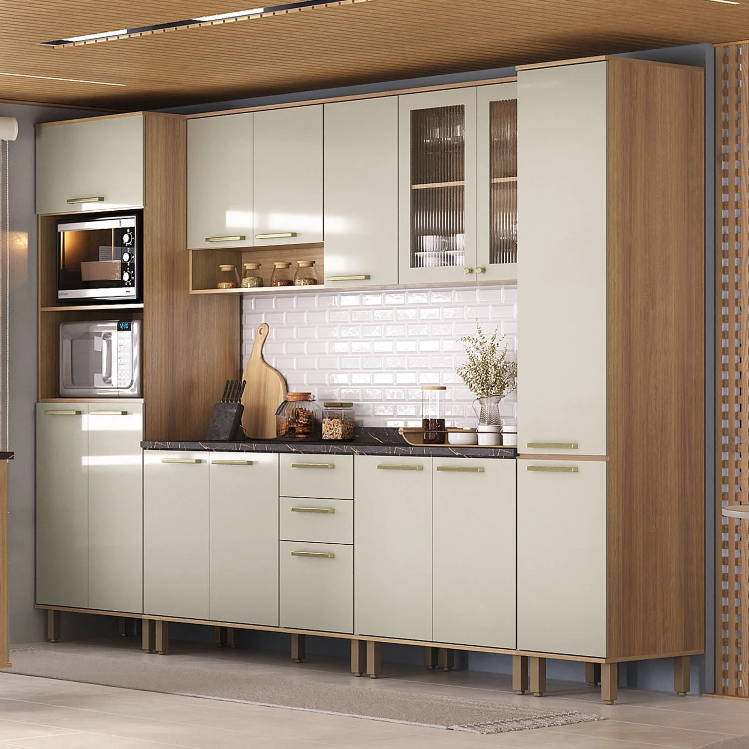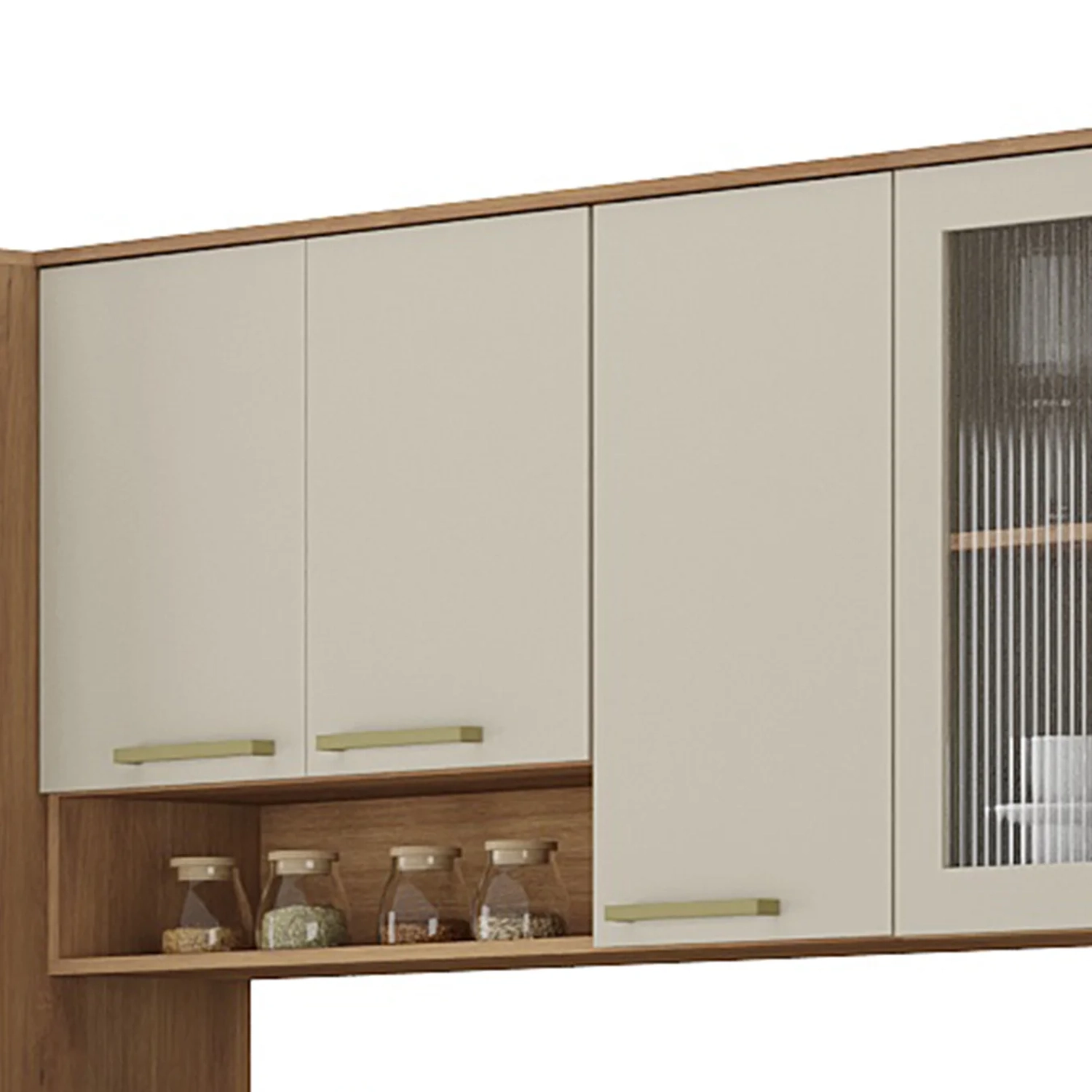 São dois Armários Aéreos que combinam estilo e utilidade. Um com três portas e nicho, outro com portas de vidro canelado e prateleira interna, ambos possuem portas com dobradiças com sistema de amortecimento.