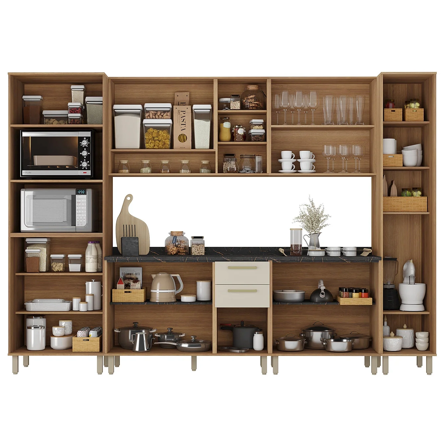 O Armário de Cozinha é a escolha perfeita para quem busca praticidade e organização no dia a dia. Ele inclui dois paneleiros, um deles possui quatro prateleiras internas e portas com amortecimento, ideal para organizar mantimentos e utensílios. Já o Paneleiro Torre Quente conta com dois nichos, perfeitos para acomodar o micro-ondas e o forno elétrico, otimizando o espaço.