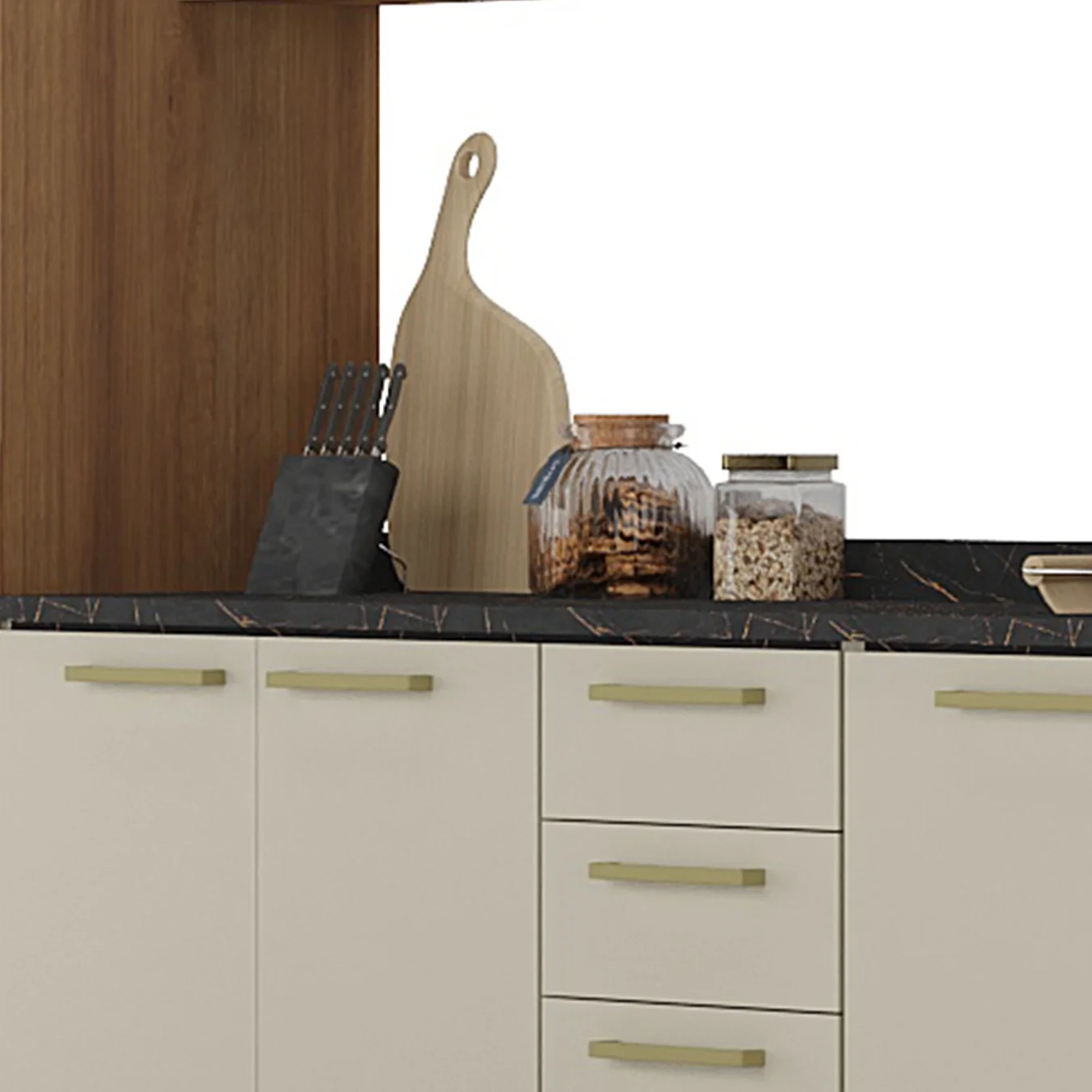 O Balcão Gabinete dispõe de três portas, gavetas com corrediças telescópicas e prateleira interna. O segundo balcão tem duas portas e prateleira, sendo ideal para itens do dia a dia. Ambos acompanham tampo em MDP de 25mm, resistente e fácil de limpar.