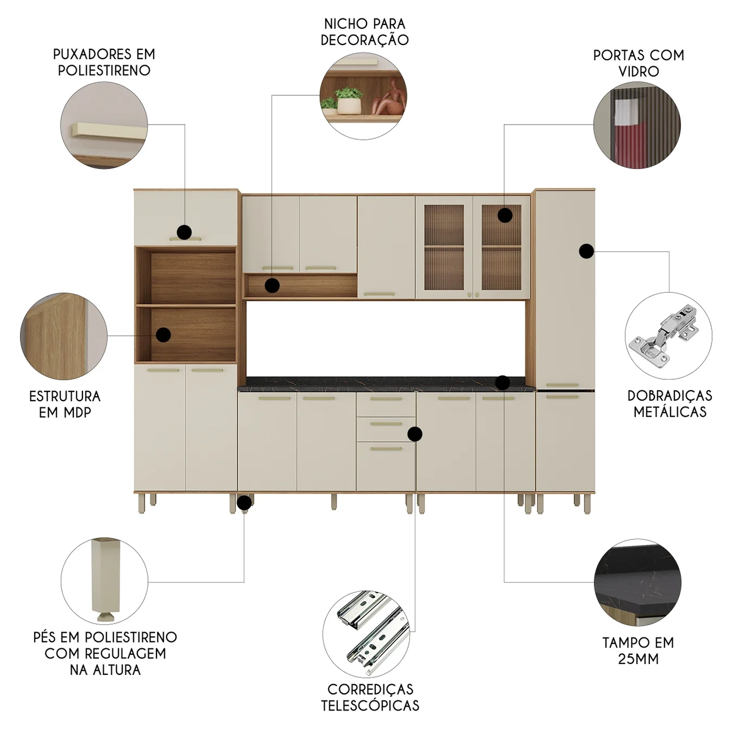 Tanto os balcões quanto os paneleiros são equipados com pés com regulagem de altura, proporcionando mais estabilidade e adaptação ao seu ambiente. Os puxadores em poliestireno adicionam durabilidade e um toque sofisticado aos móveis. Uma escolha prática e organizada para transformar sua Cozinha.