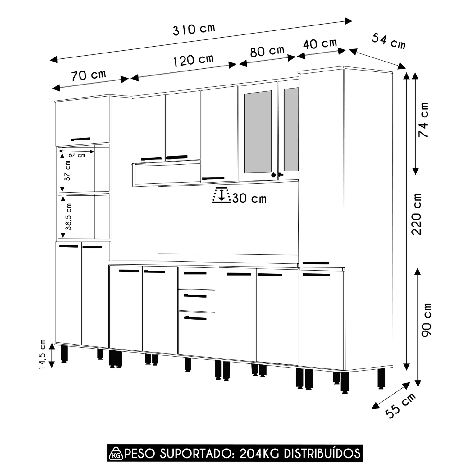 Peso Suportado Distribuído: Paneleiros 90kg/ Aéreos 34kg/ Balcões 65 kg/ Tampo 15kg.