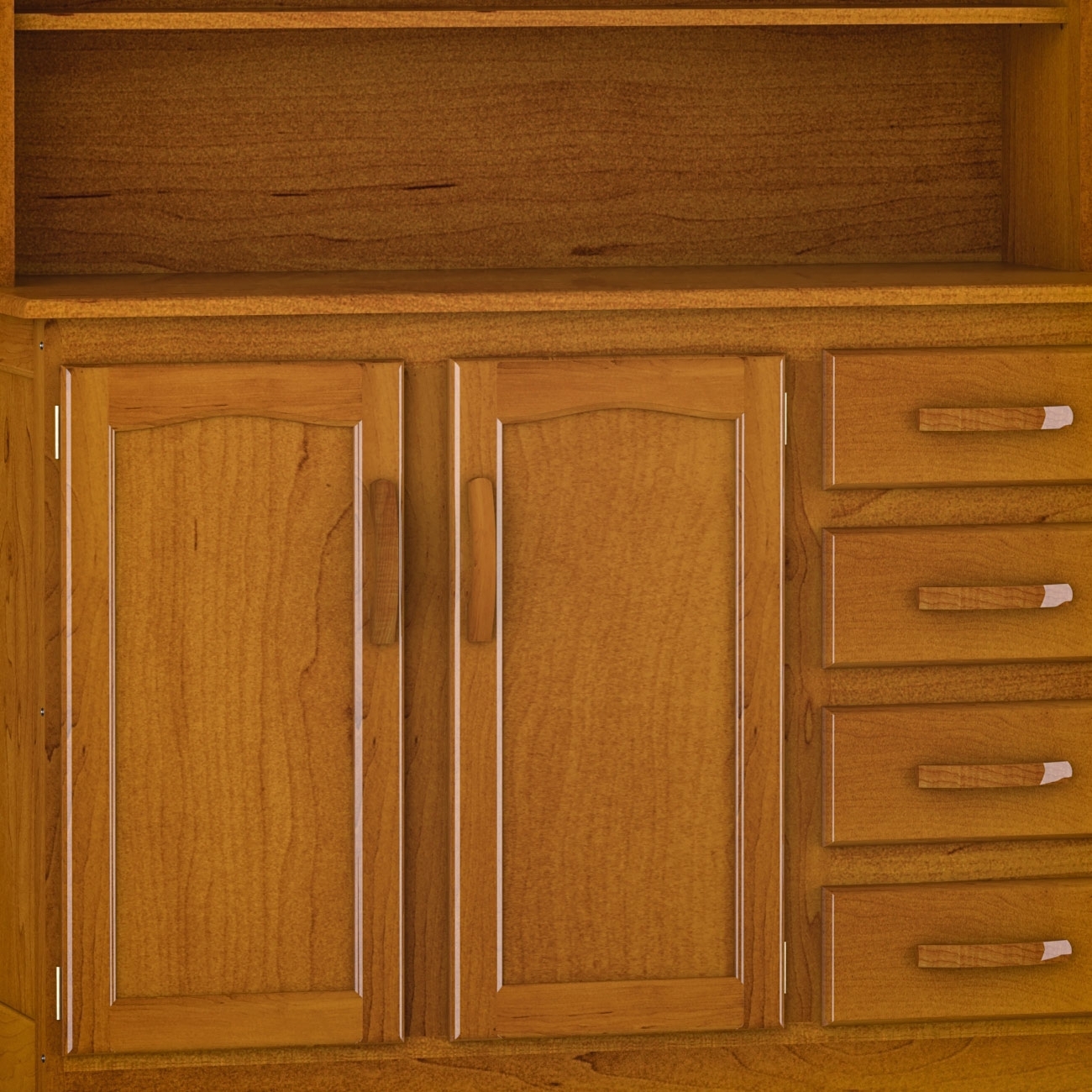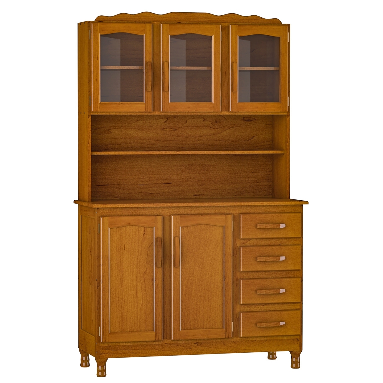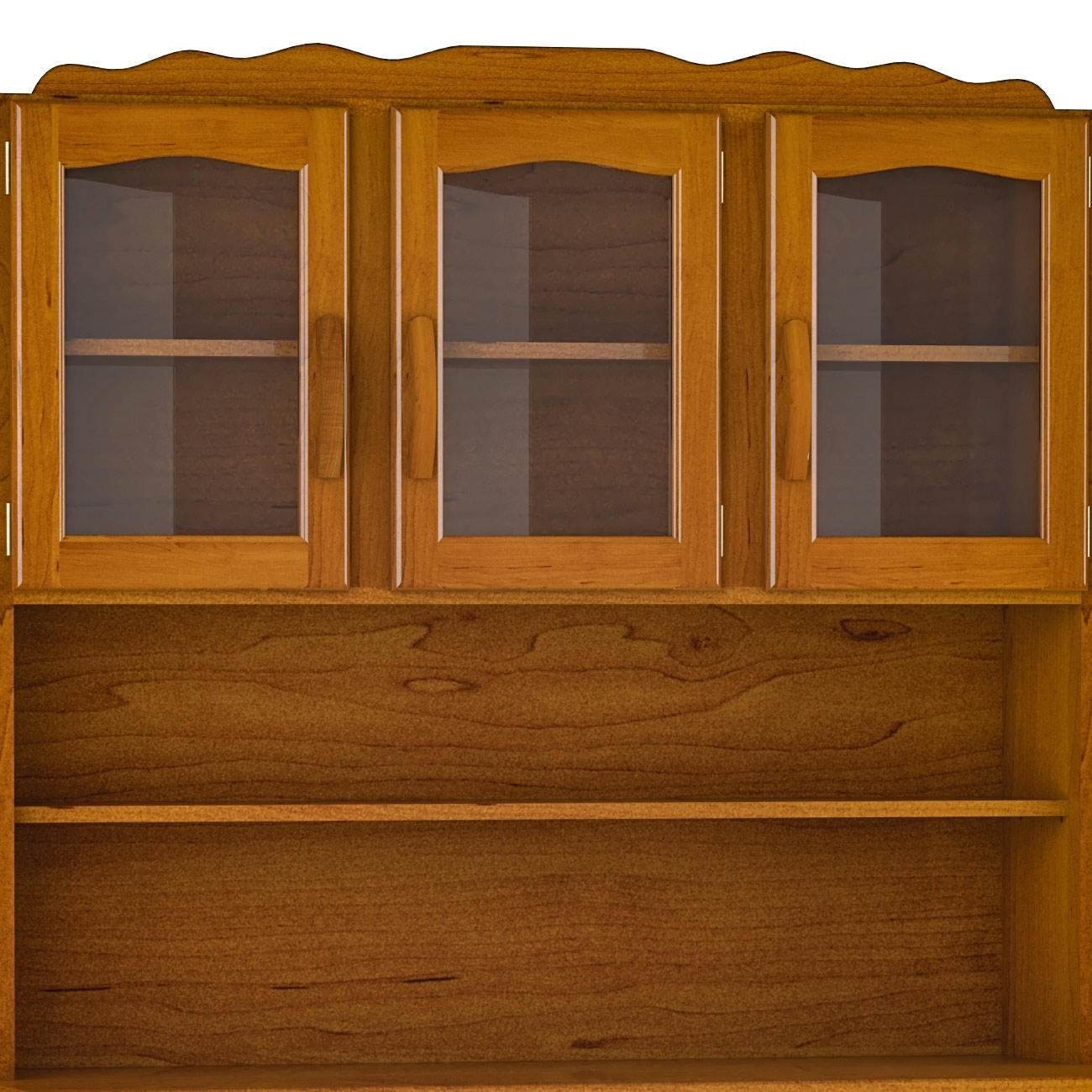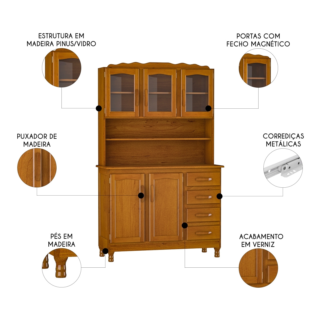 A estrutura em madeira pinus garante durabilidade e resistência, enquanto portas de vidro e madeira, detalhes ondulados e pés torneados conferem elegância e personalidade ao móvel.
