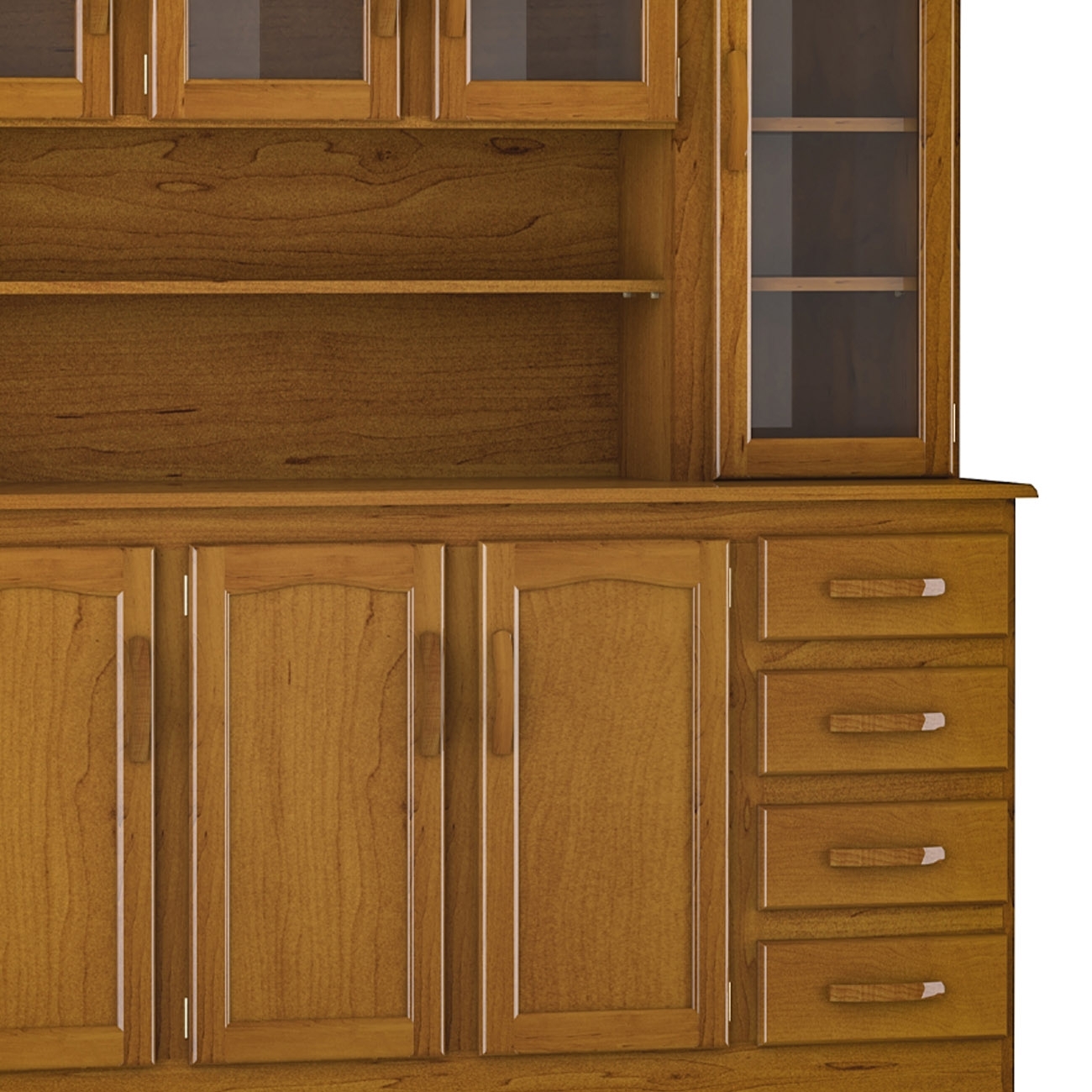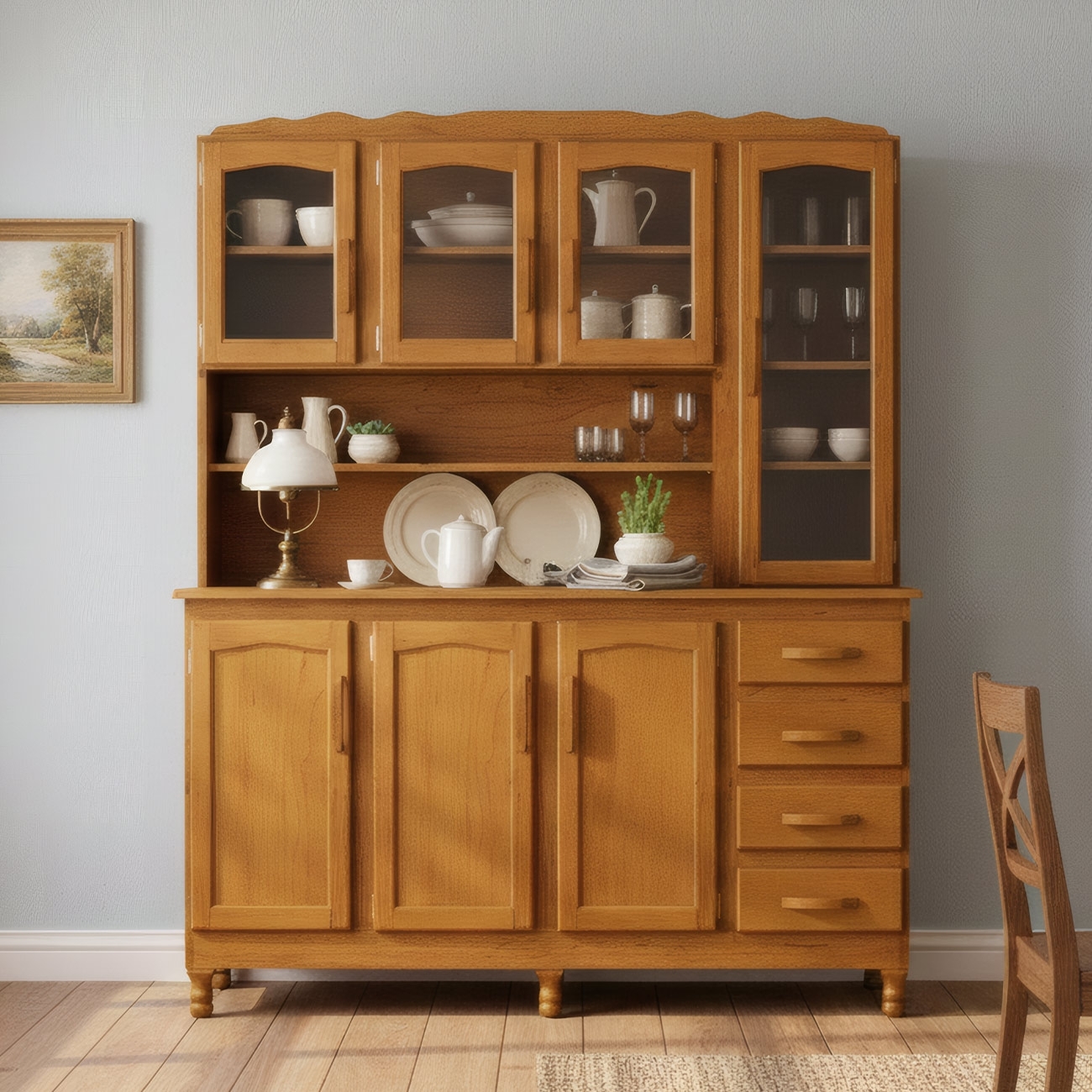 A estrutura em madeira pinus garante durabilidade, enquanto portas de vidro e madeira, pés torneados e detalhes ondulados oferecem charme rústico e personalidade ao móvel.