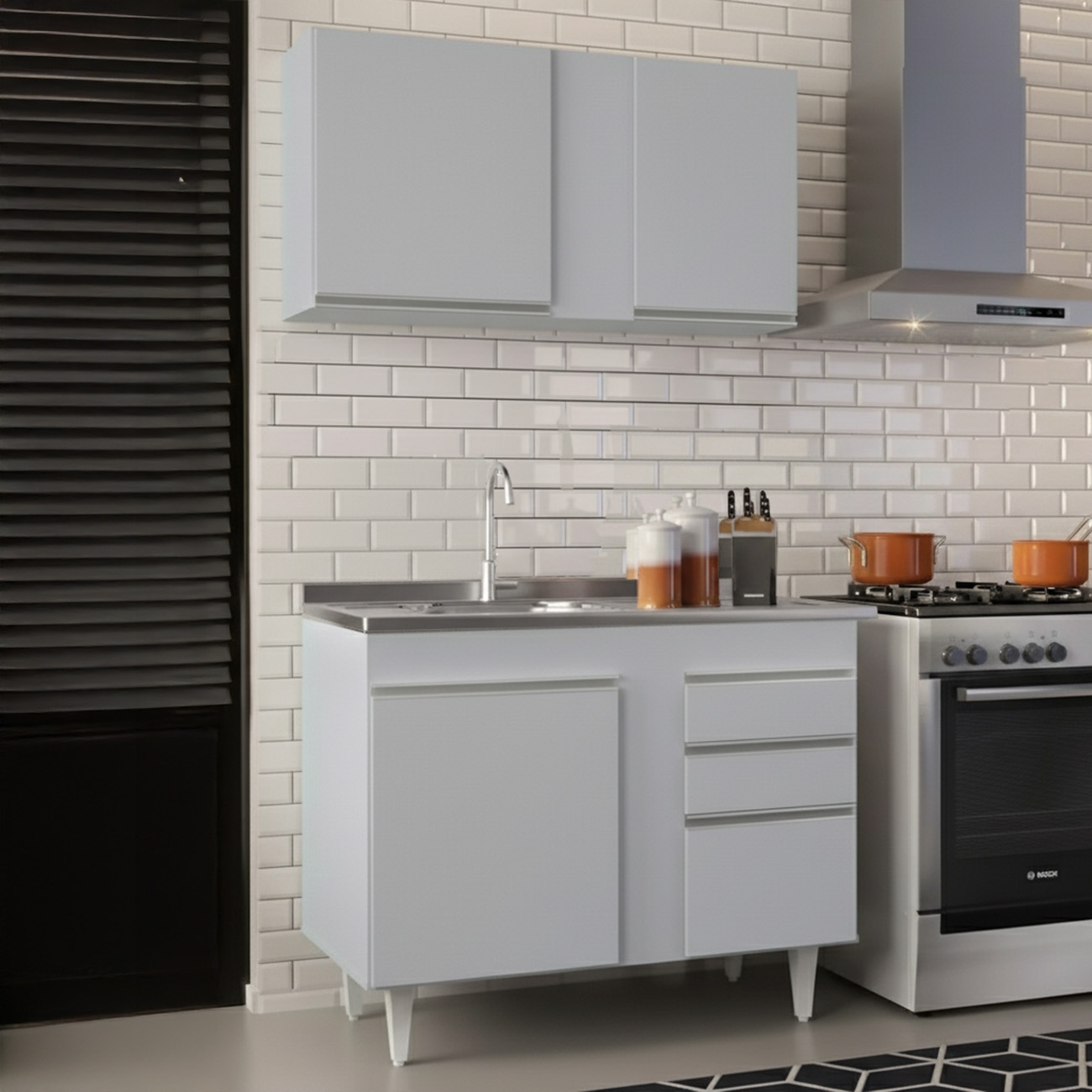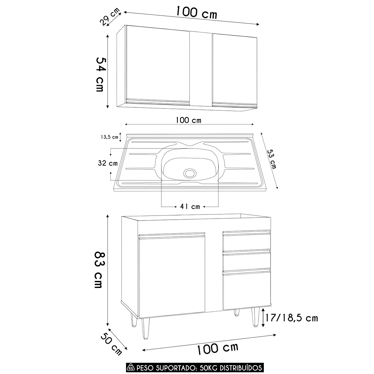 Conteúdo da Embalagem: 1 Armário Aéreo, 1 Balcão e 1 Pia.