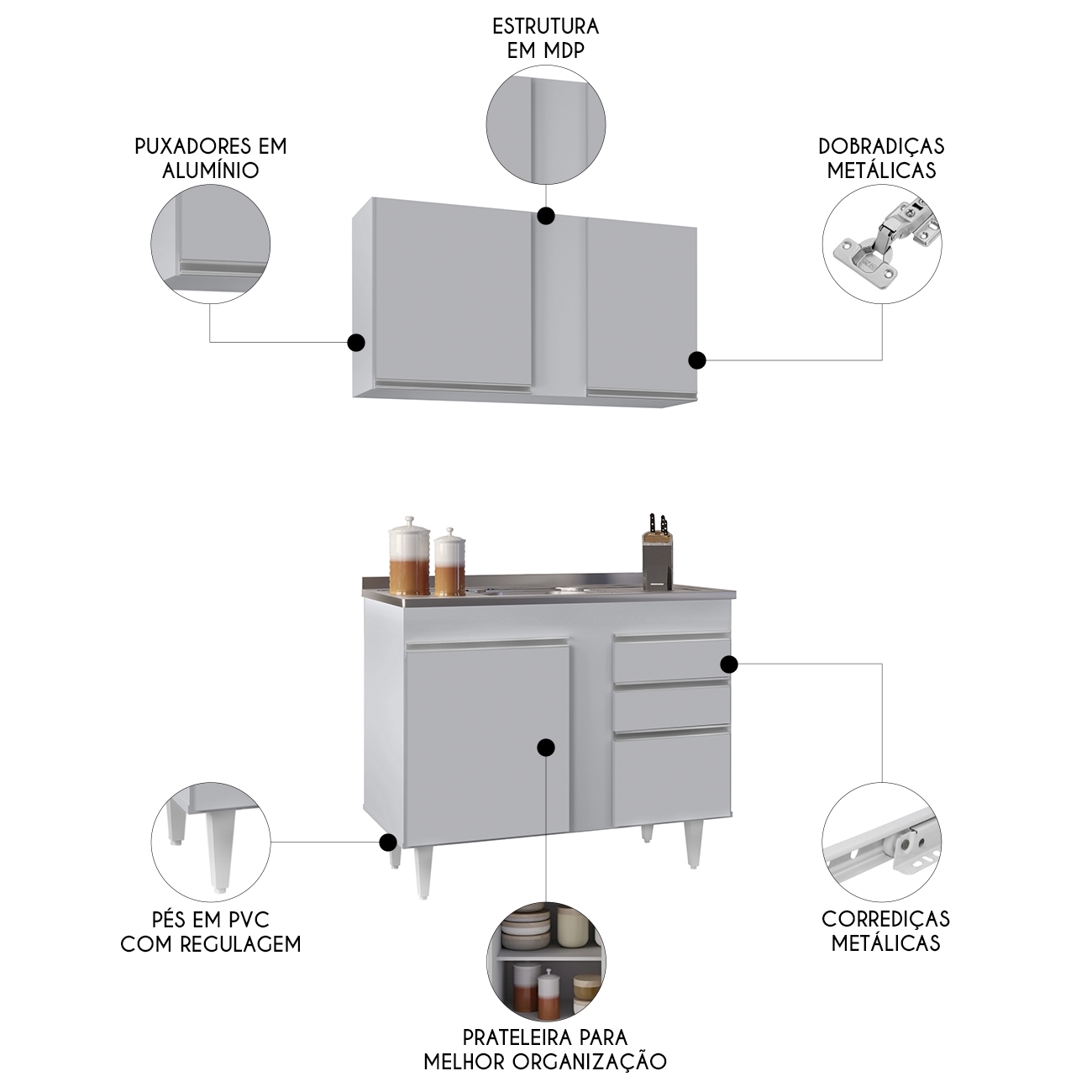 Armário Cozinha e Balcão Com Pia 100cm Luziania Cinza Claro - Lumil
