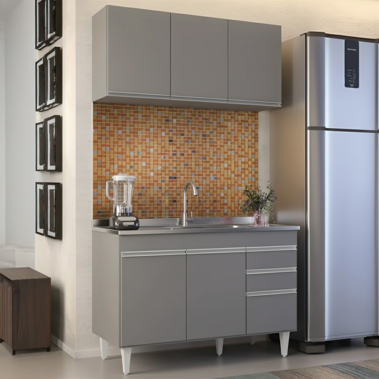 Perfeito para compor uma Cozinha Moderna, o Armário Aéreo e Balcão com Pia Inox, com cuba e válvula, traz equilíbrio entre estilo e praticidade, tornando o espaço mais funcional e acolhedor no dia a dia.