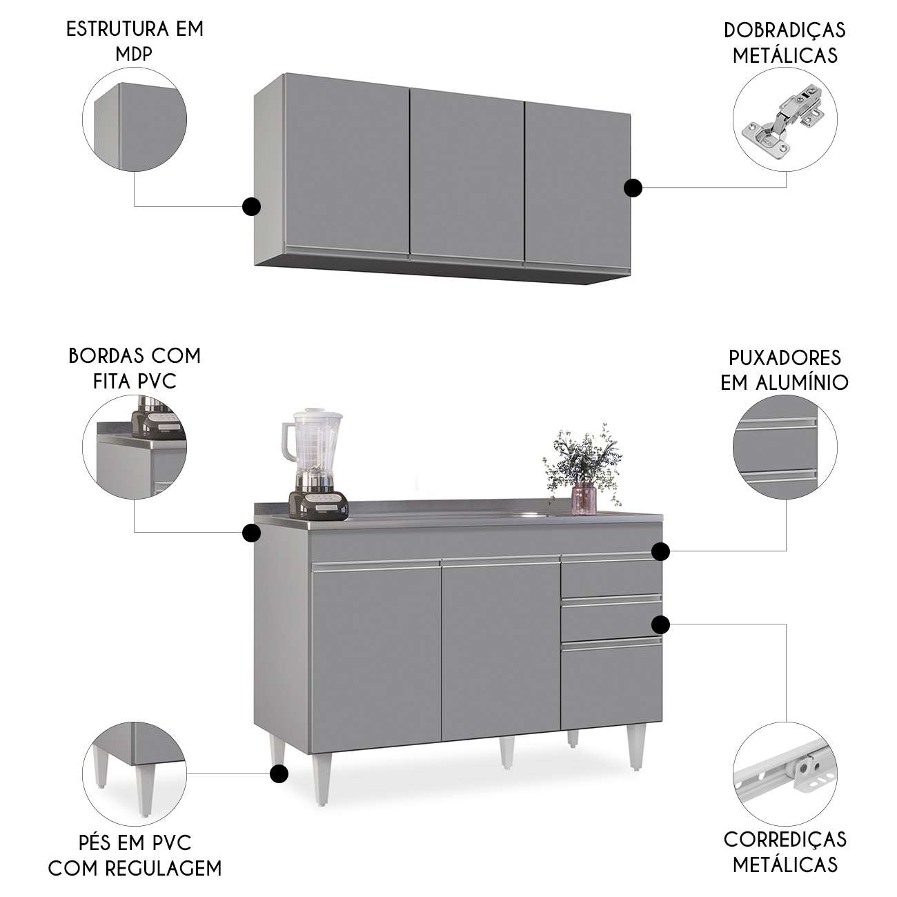 Conteúdo da Embalagem: 1 Armário Aéreo, 1 Balcão, 1 Pia.