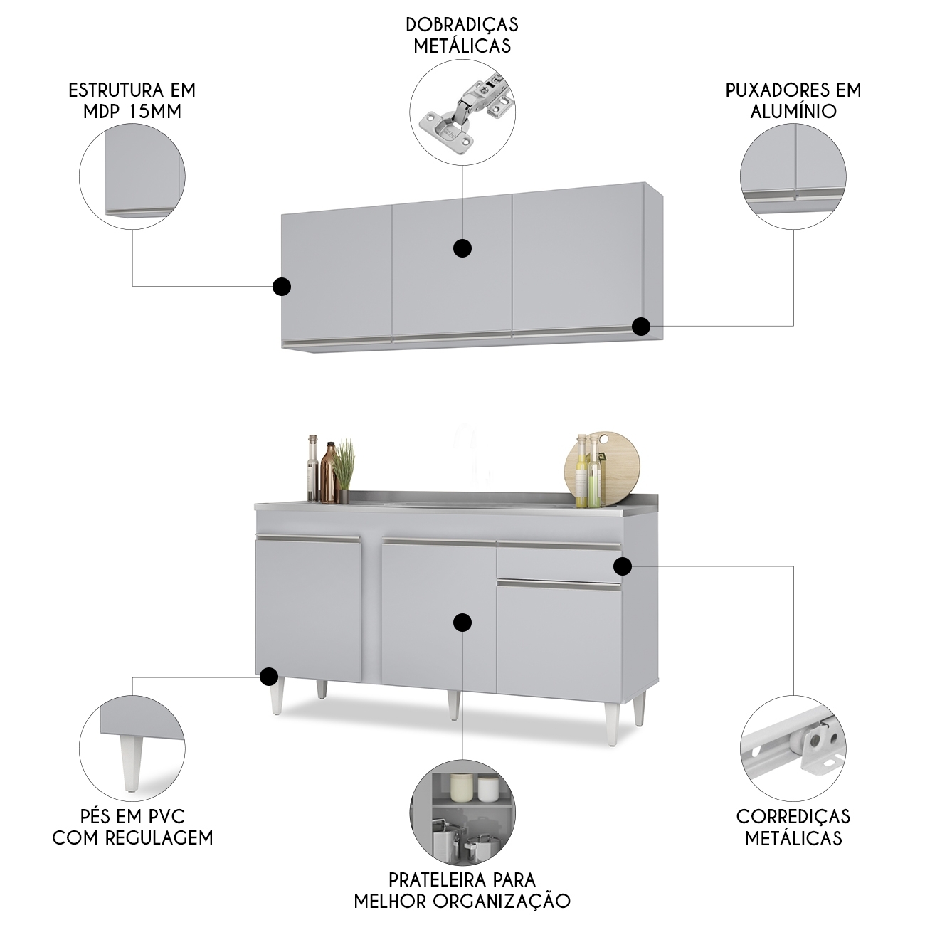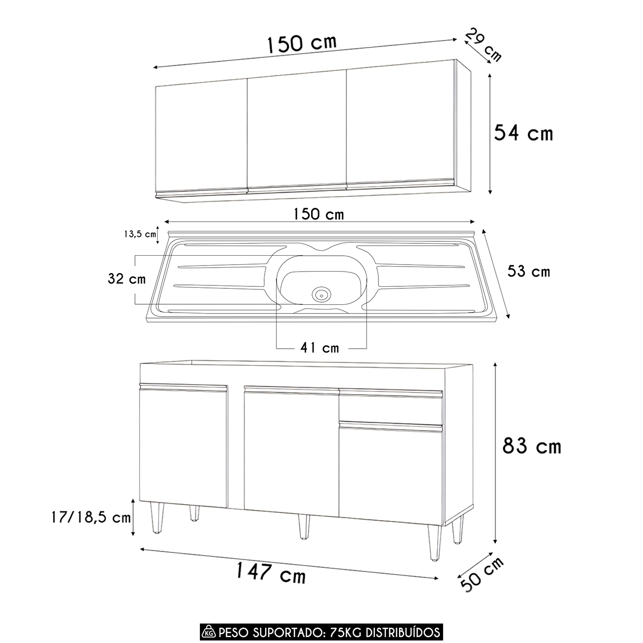 Conteúdo da Embalagem: 1 Armário Aéreo, 1 Balcão, 1 Pia.