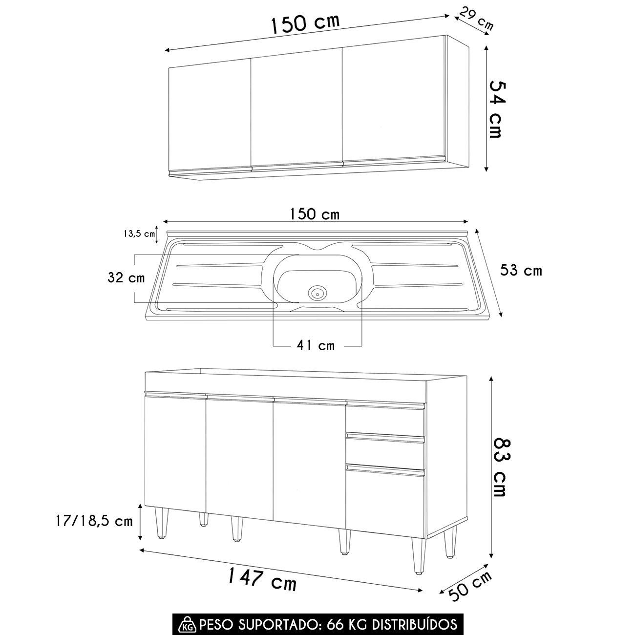 O amplo interior do Armário Aéreo e do Balcão oferece prateleiras que mantêm tudo no lugar o Balcão, com Pia Inox cuba e válvula, possui duas gavetas para otimizar ainda mais o espaço.