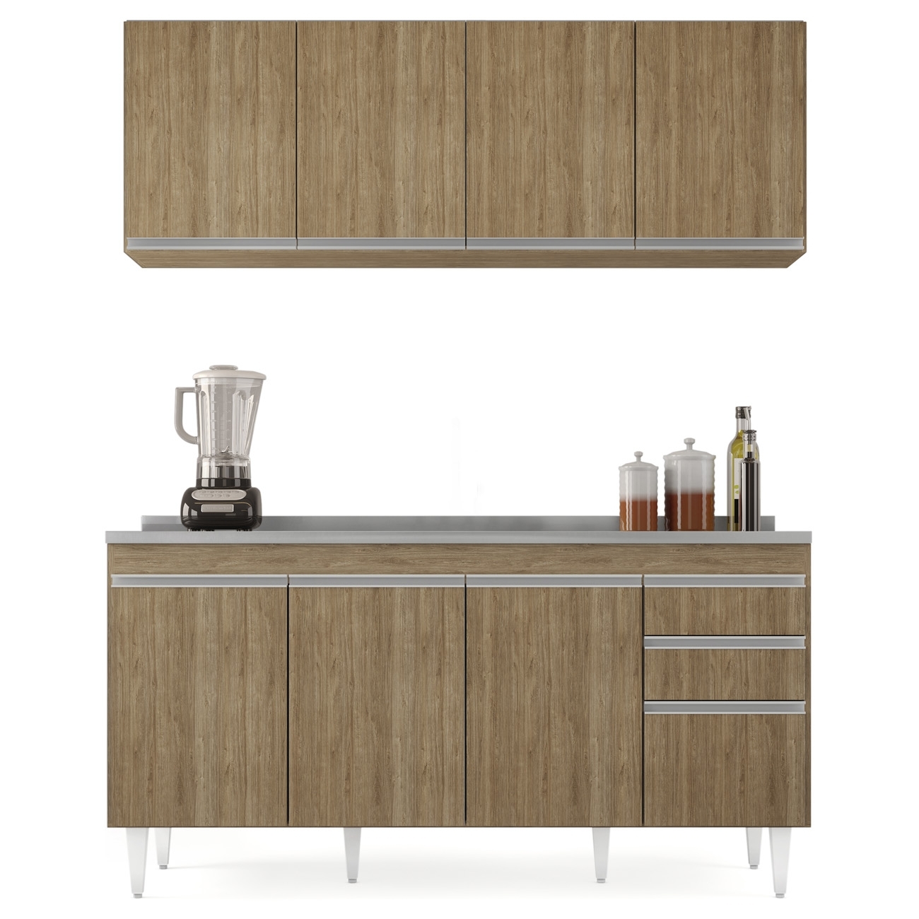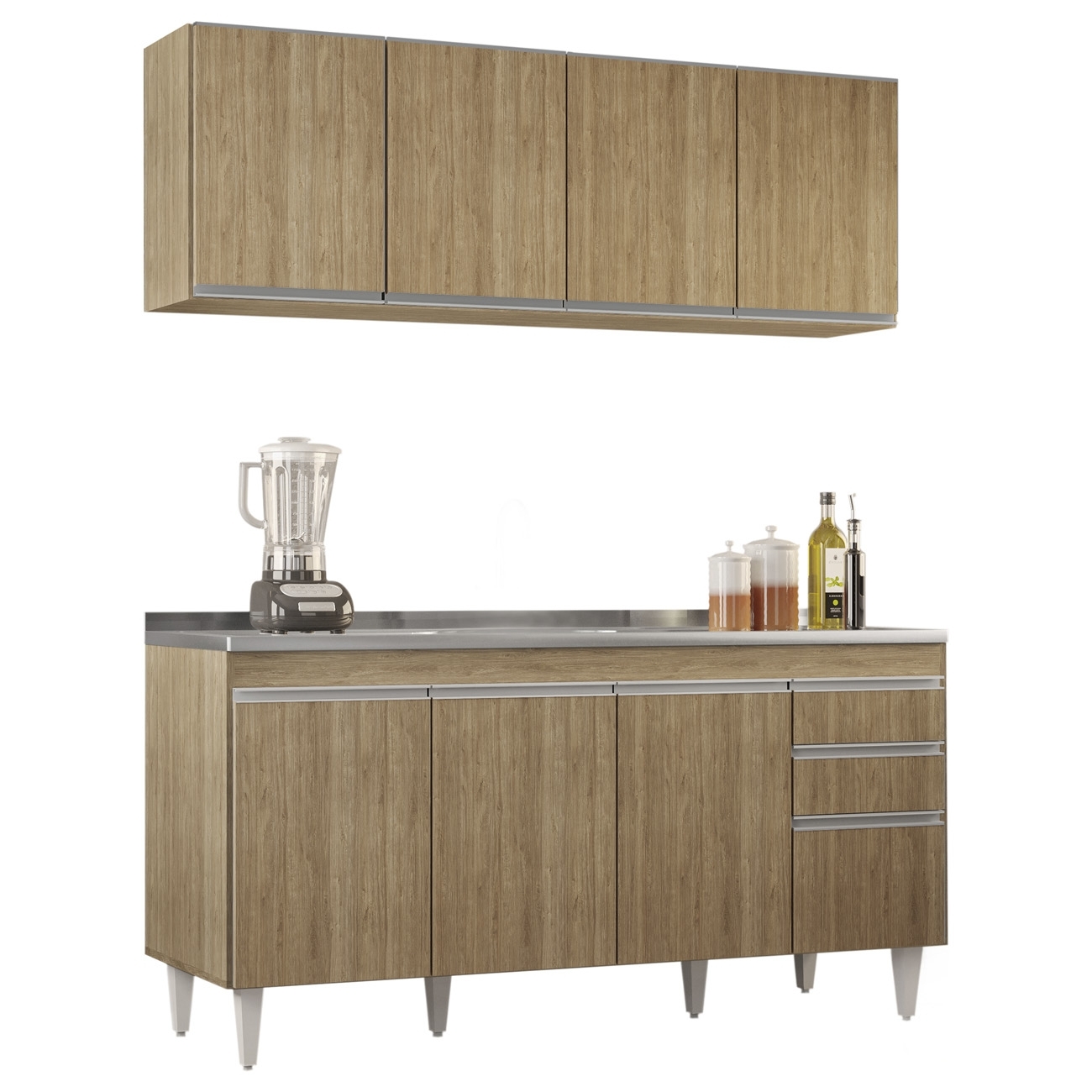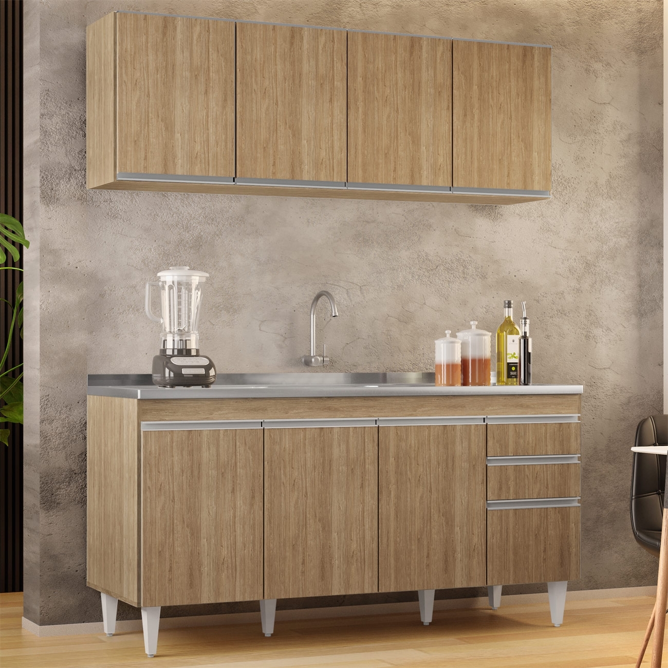 Ideal para compor uma Cozinha Moderna, o Armário Aéreo e Balcão com Pia Inox, com cuba e válvula, combina praticidade e elegância, tornando o espaço mais funcional e agradável no cotidiano.