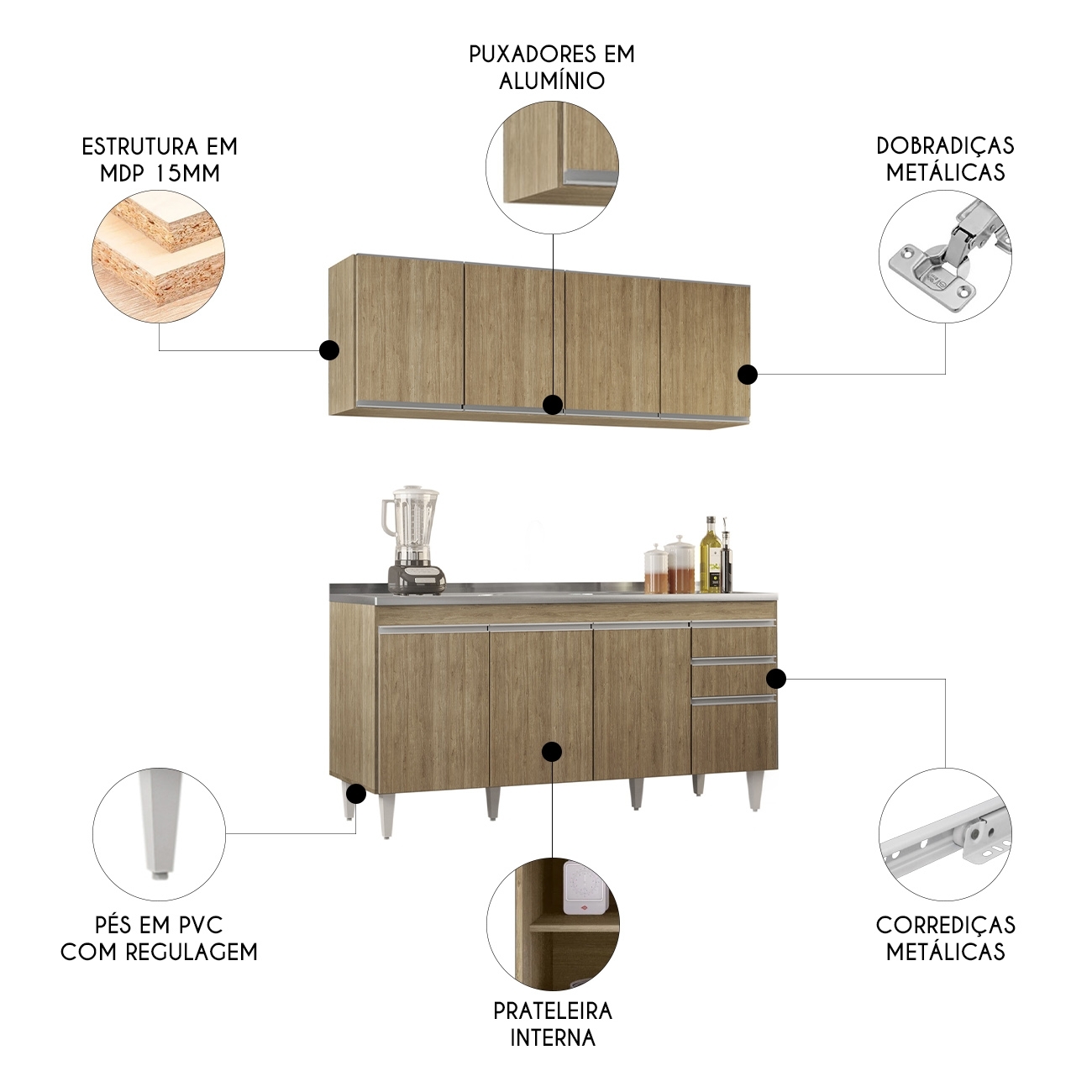 Conteúdo da Embalagem: 1 Armário aéreo, 1 Balcão, 1 Pia.