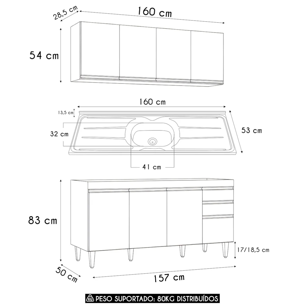 Peso Suportado Distribuídos: Balcão 40 Kg/ Armário 40 Kg.