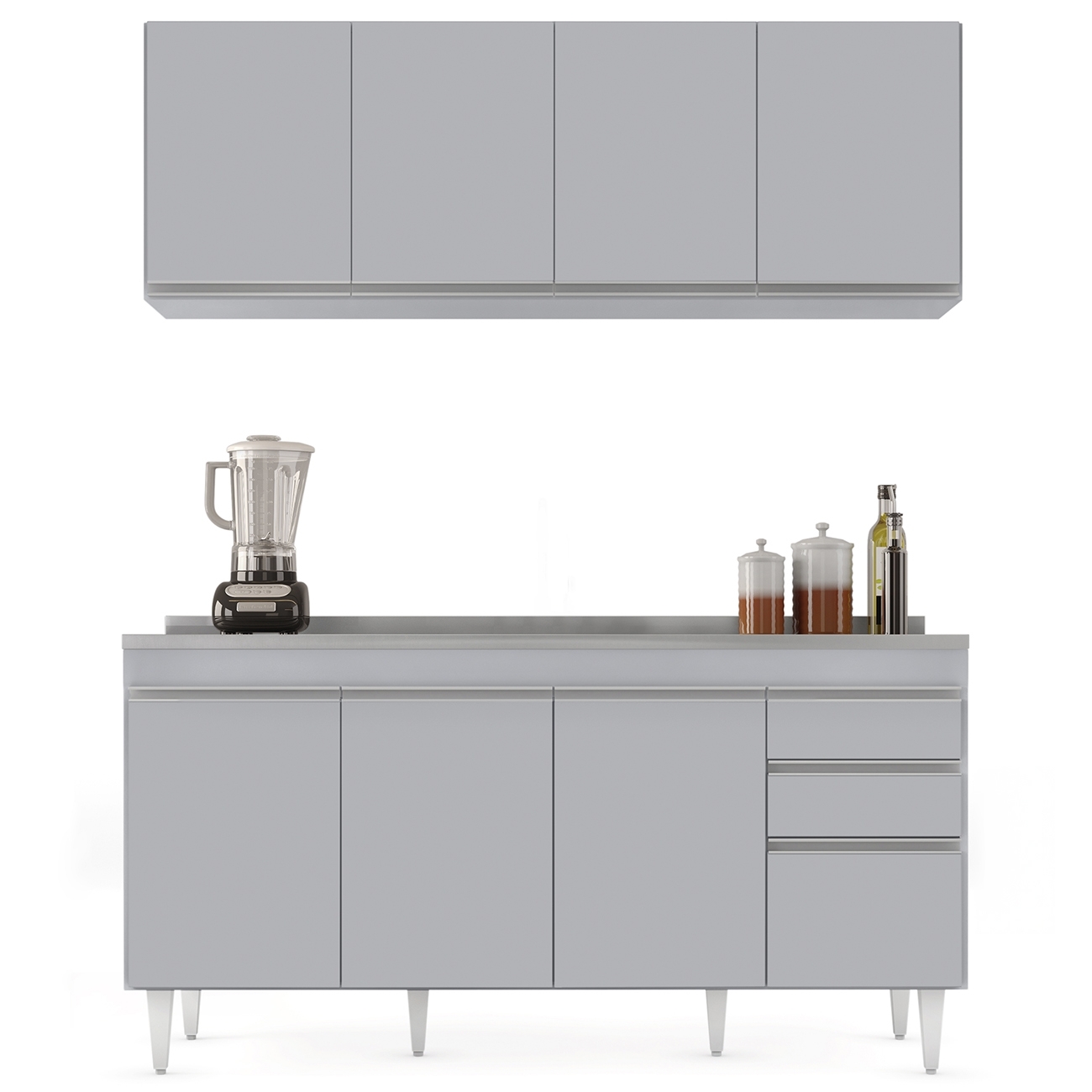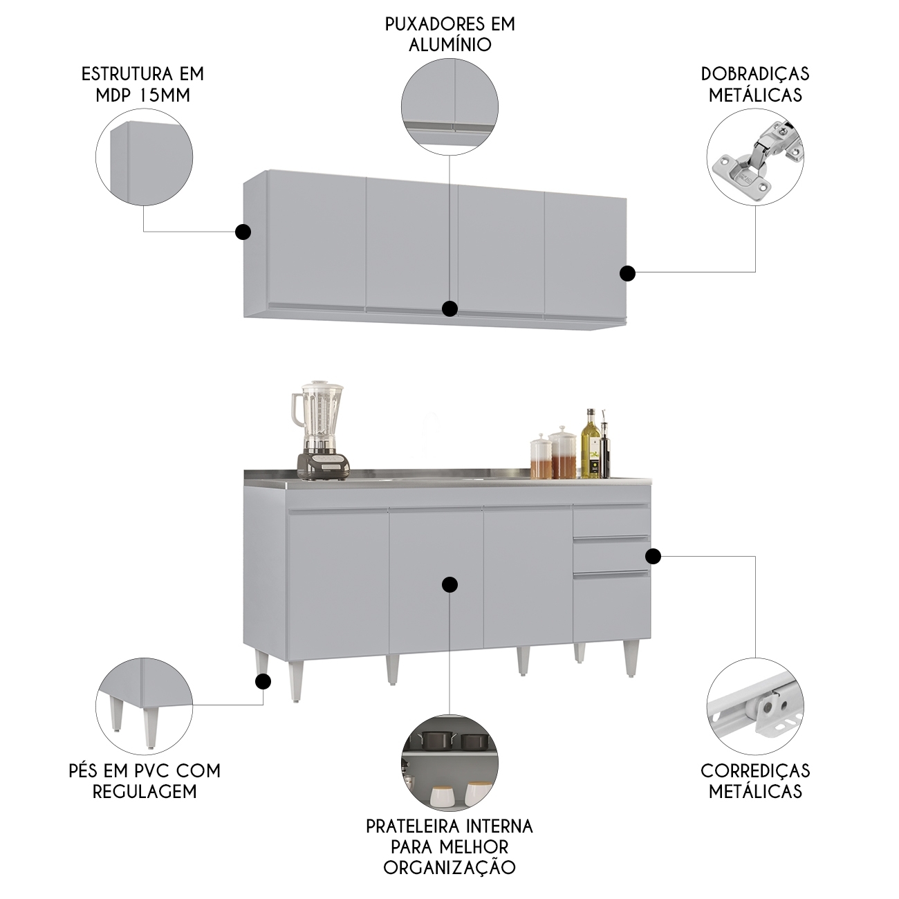 Armário Cozinha e Balcão Com Pia 160cm Arkansas Cinza Claro - Lumil