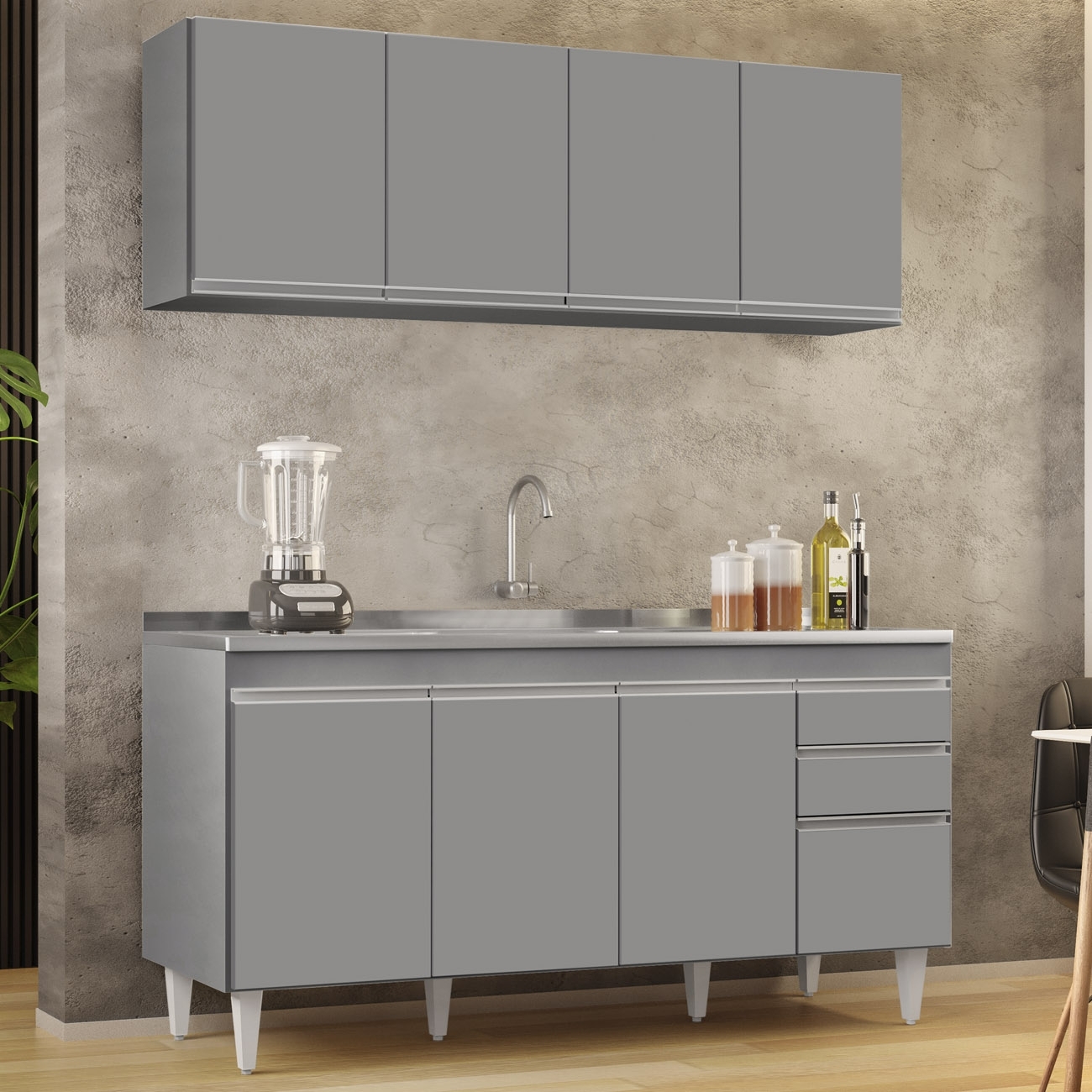 Ideal para compor uma Cozinha Moderna, o Armário Aéreo e Balcão com Pia Inox, com cuba e válvula, combina praticidade e elegância, tornando o espaço mais funcional e agradável no cotidiano.