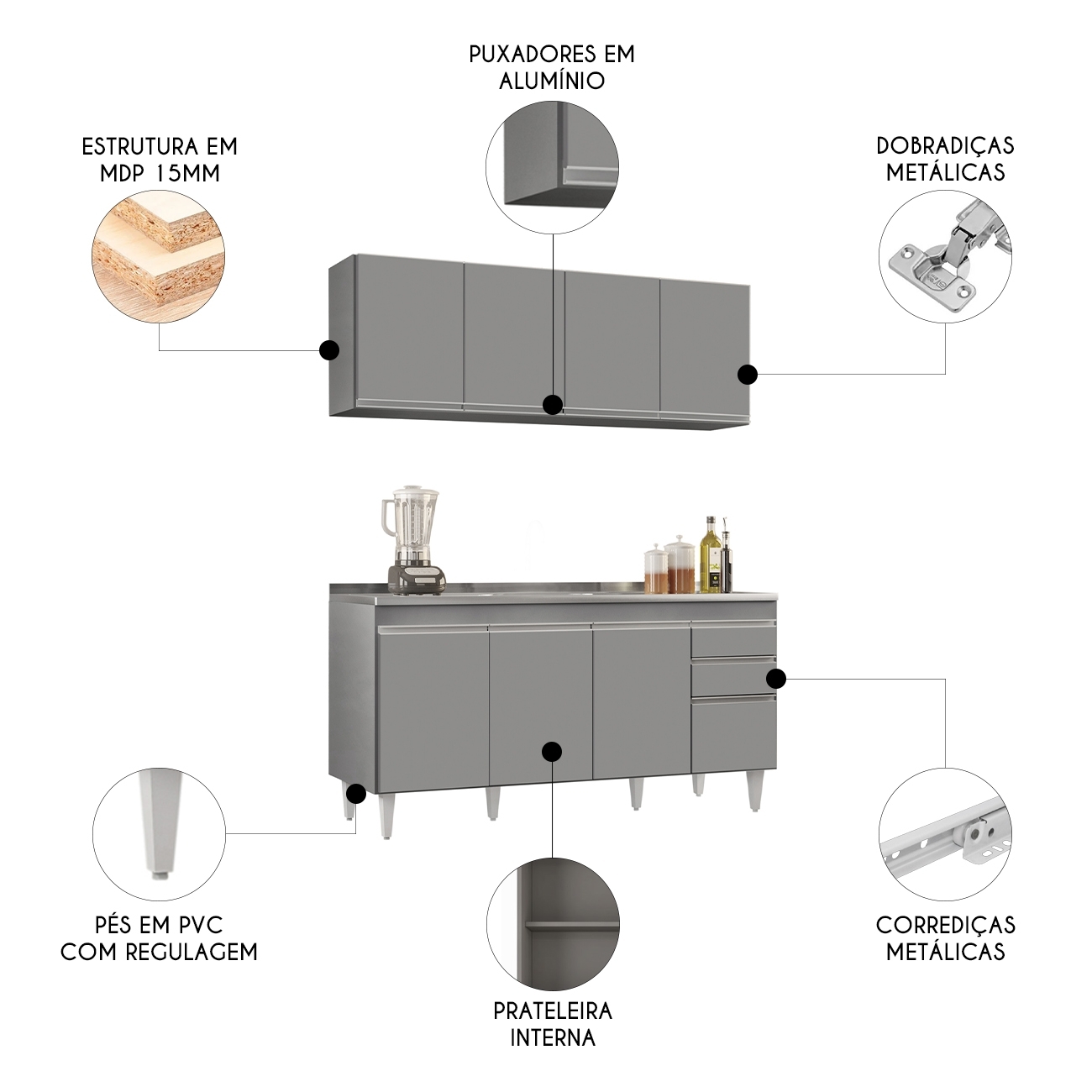 Conteúdo da Embalagem: 1 Armário aéreo, 1 Balcão, 1 Pia.