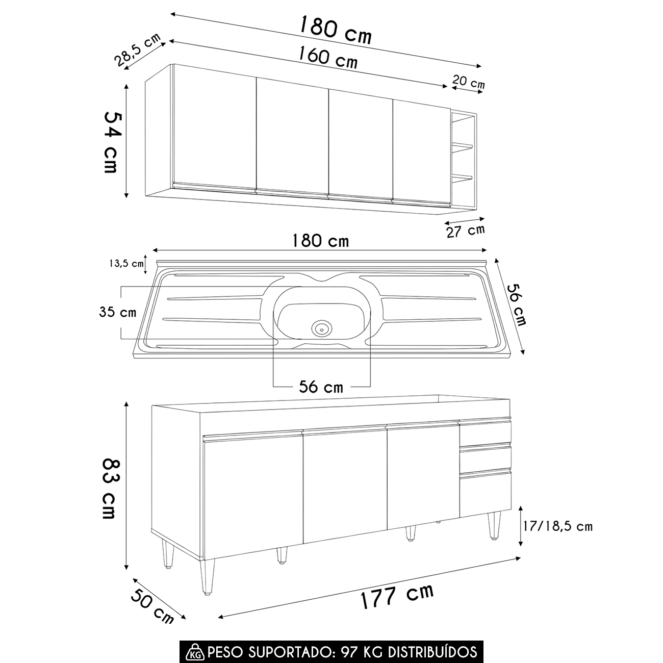 Conteúdo da Embalagem: 1 Balcão, 1 Pia,1 Armário Aéreo, 1 Nicho.