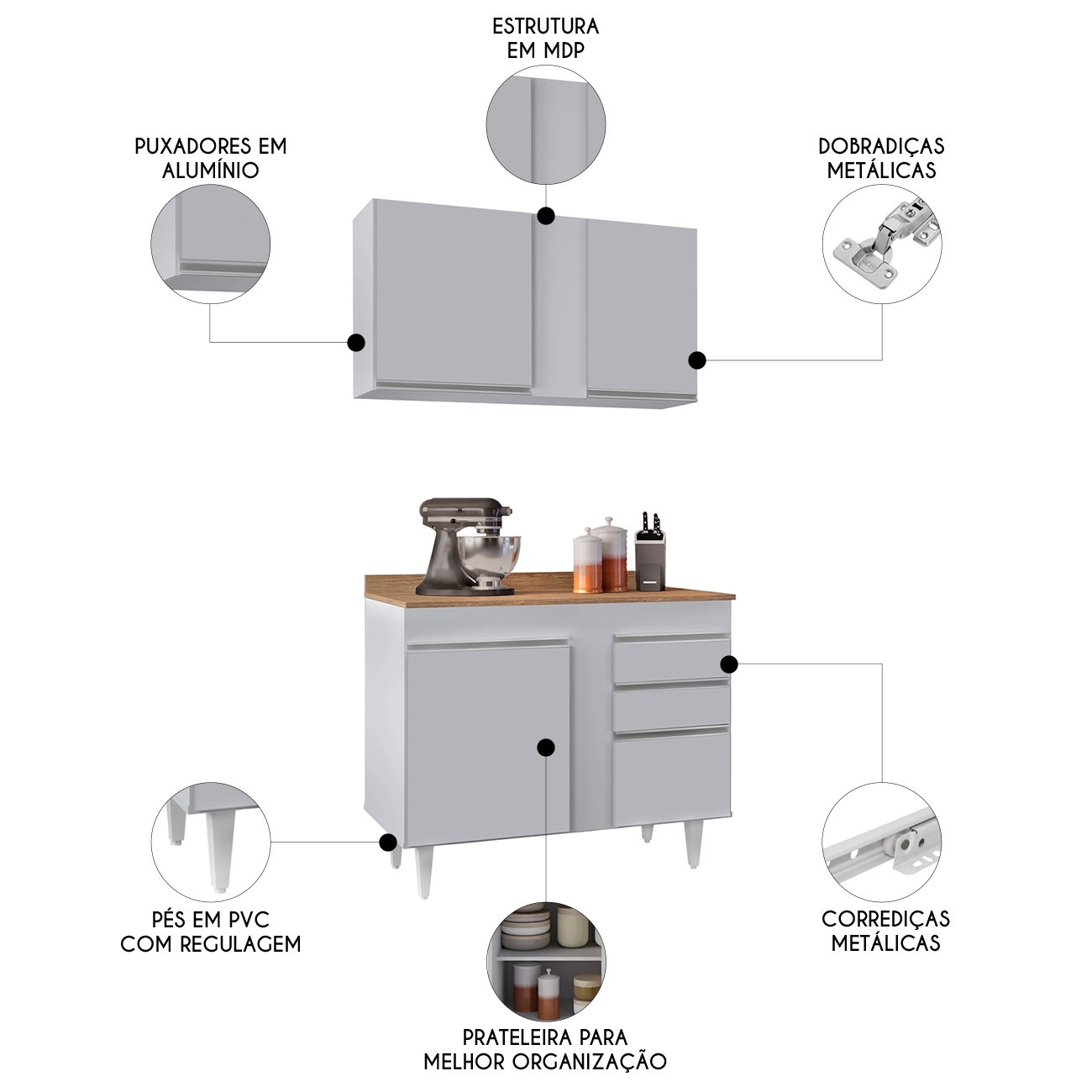 Conteúdo da Embalagem: 1 Armário Aéreo, 1 Balcão, 1 Tampo.