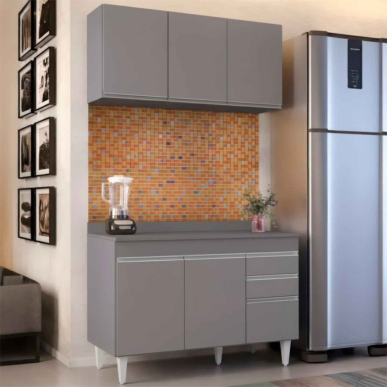 Perfeito para compor uma Cozinha Moderna, o Armário Aéreo e Balcão com Tampo traz equilíbrio entre estilo e praticidade, tornando o espaço mais funcional e acolhedor no dia a dia.