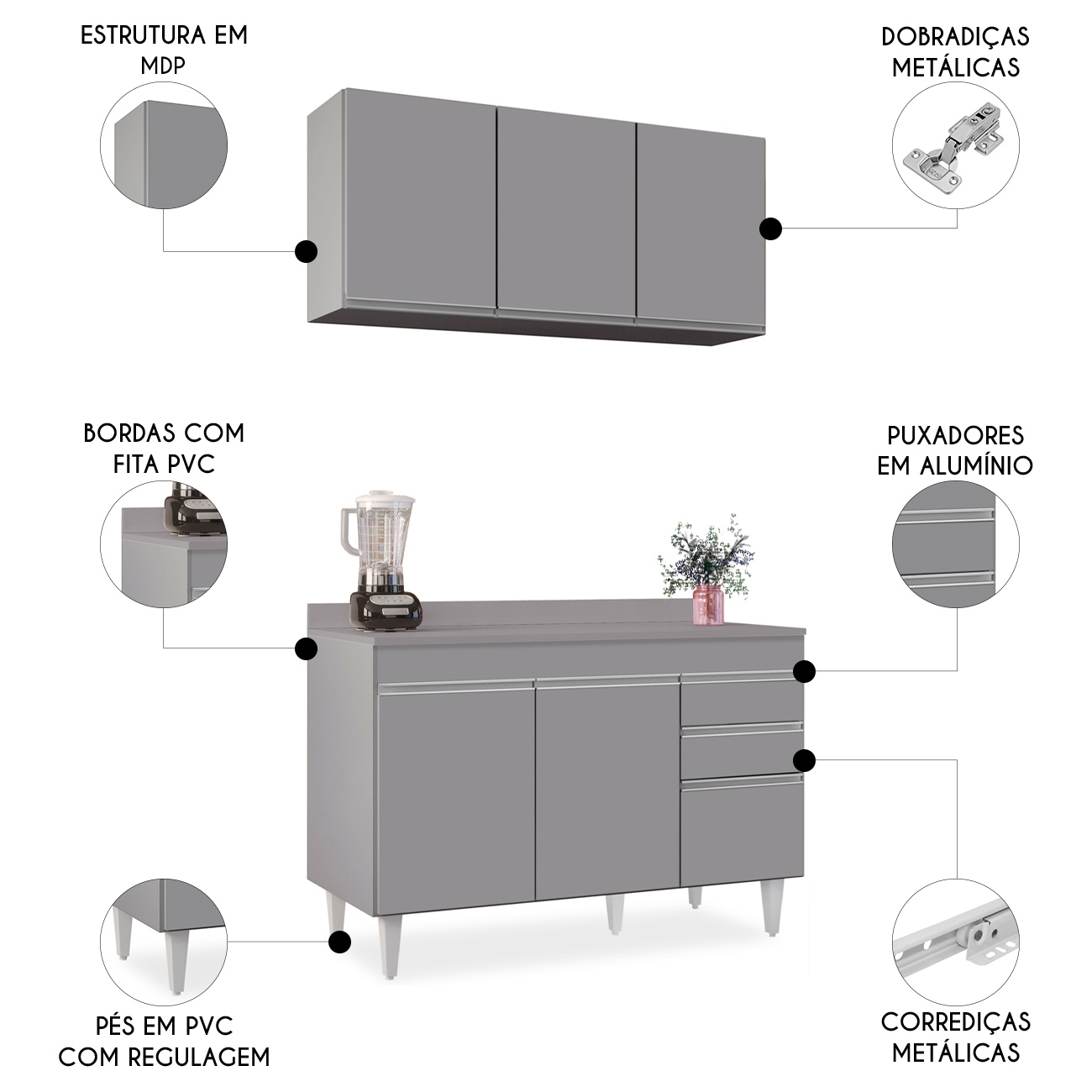 Conteúdo da Embalagem: 1 Armário Aéreo, 1 Balcão, 1 Tampo.