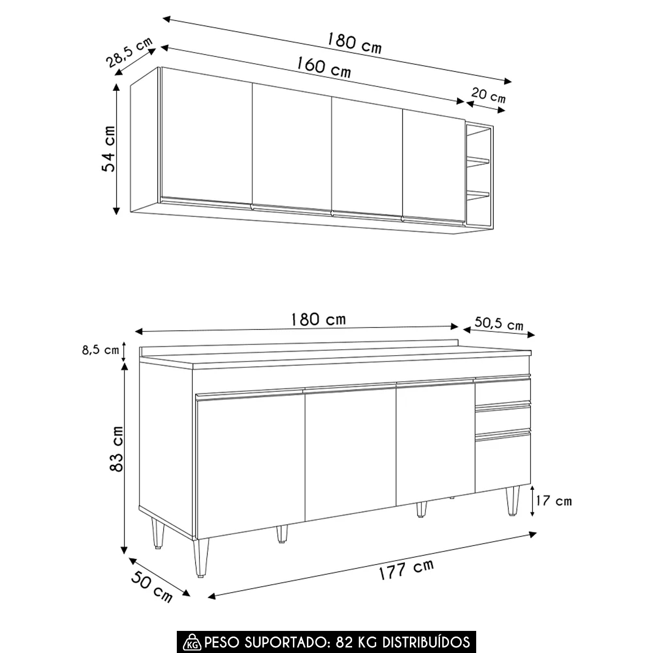 Peso Suportado Distribuído: Balcão 42 kg/ Armário 40 kg.