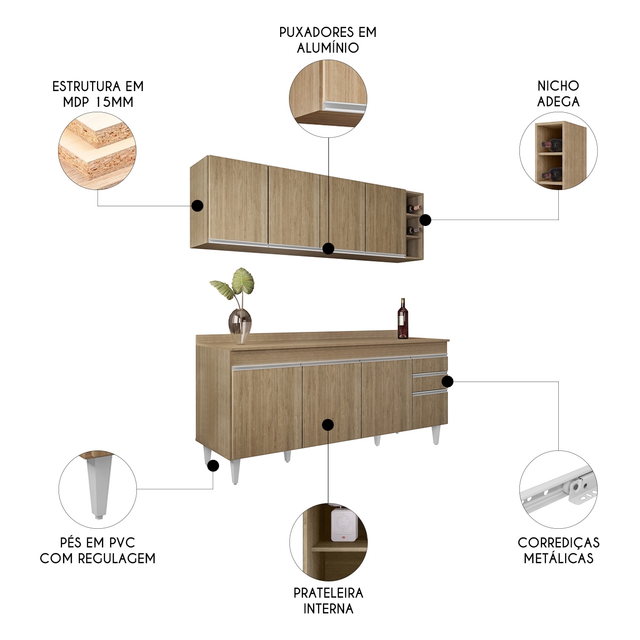 Conteúdo da Embalagem: 1 Balcão, 1 Tampo, 1 Armário Aéreo.