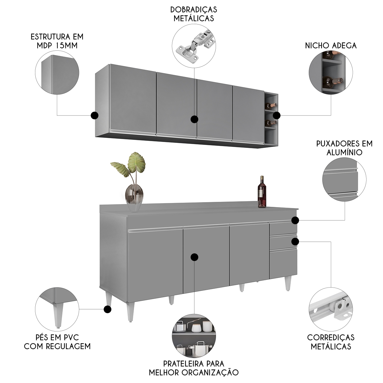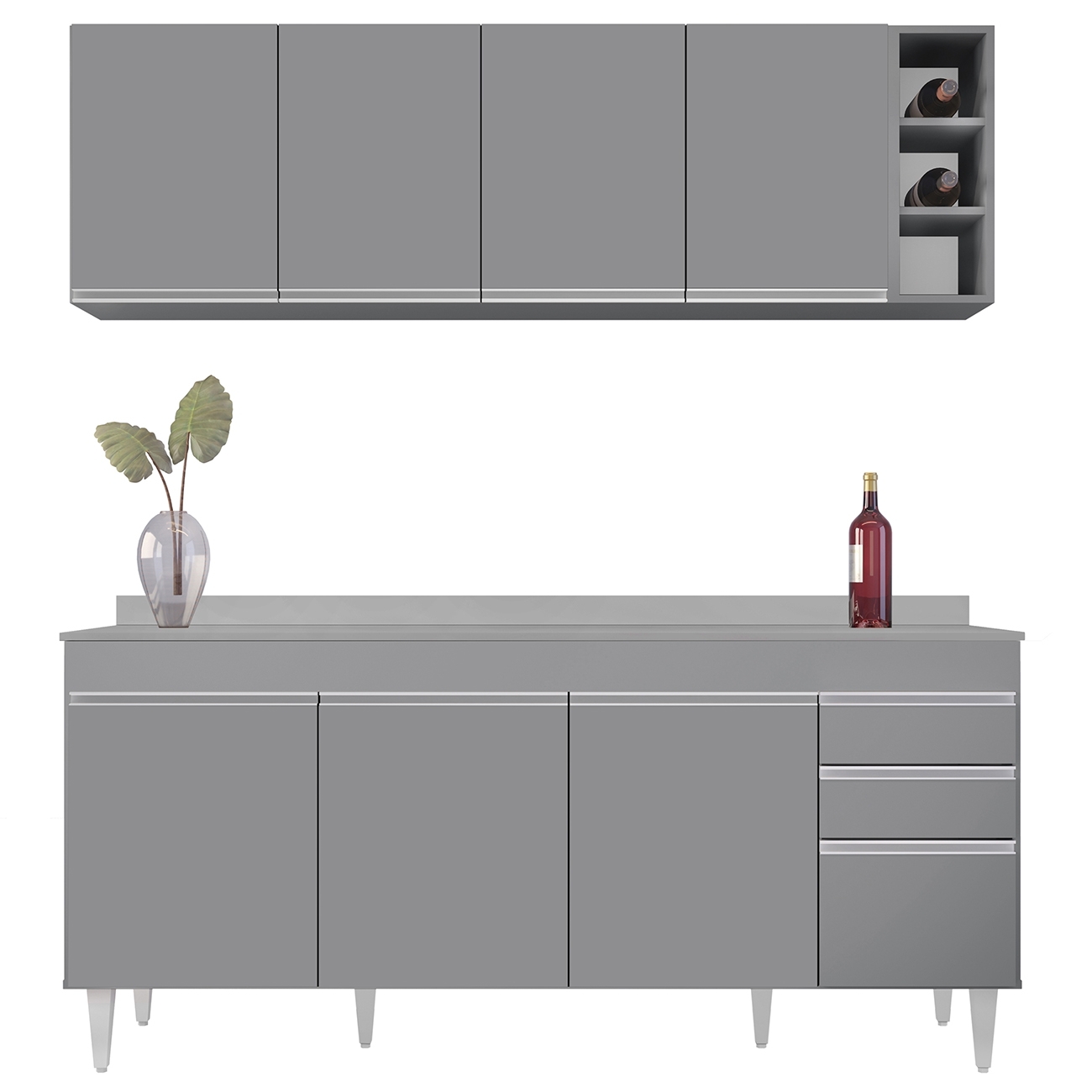 Armário Cozinha e Balcão Com Tampo 180cm Dallas Cinza - Lumil