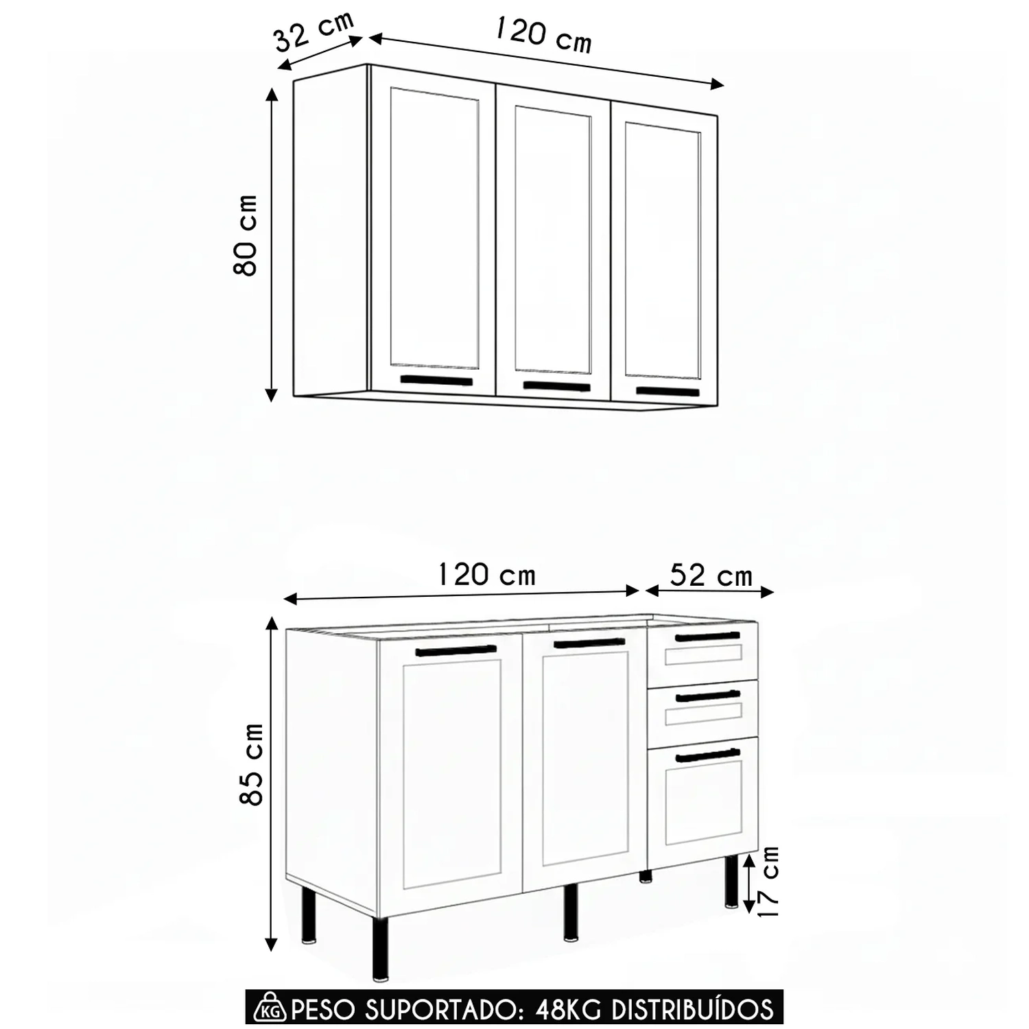 Peso Suportado Distribuído: Balcão: 28 Kg/ Armário Aéreo: 20 Kg.