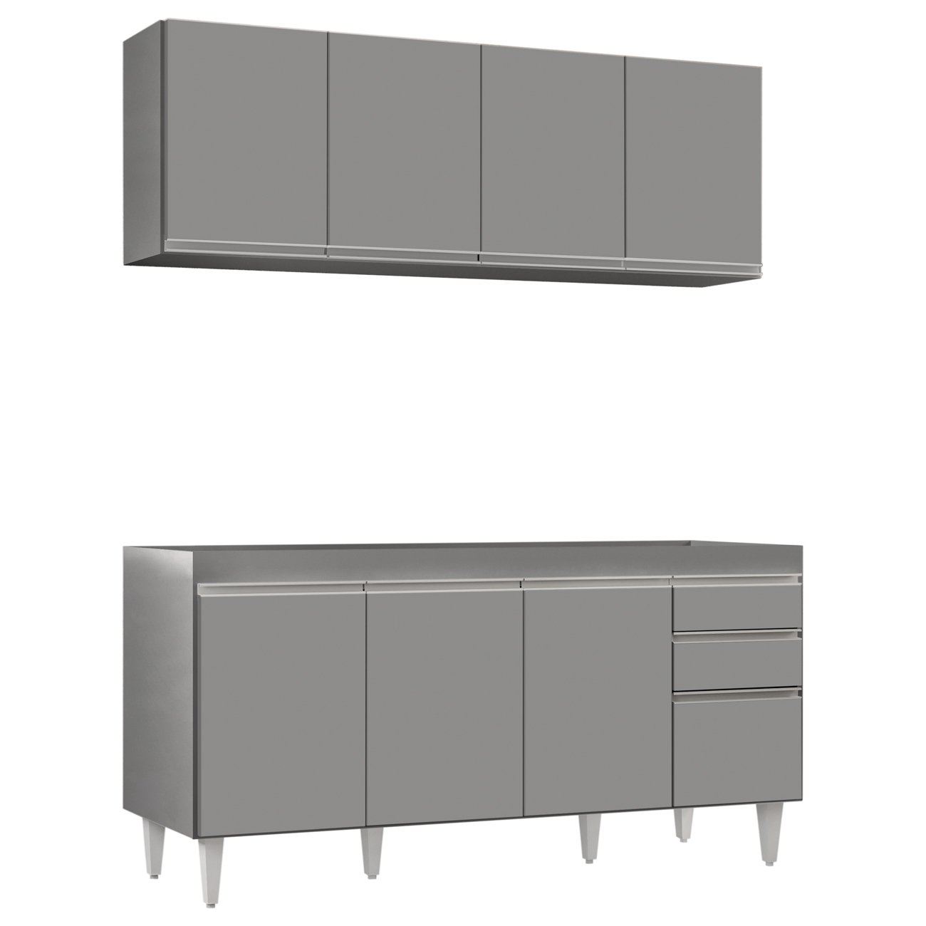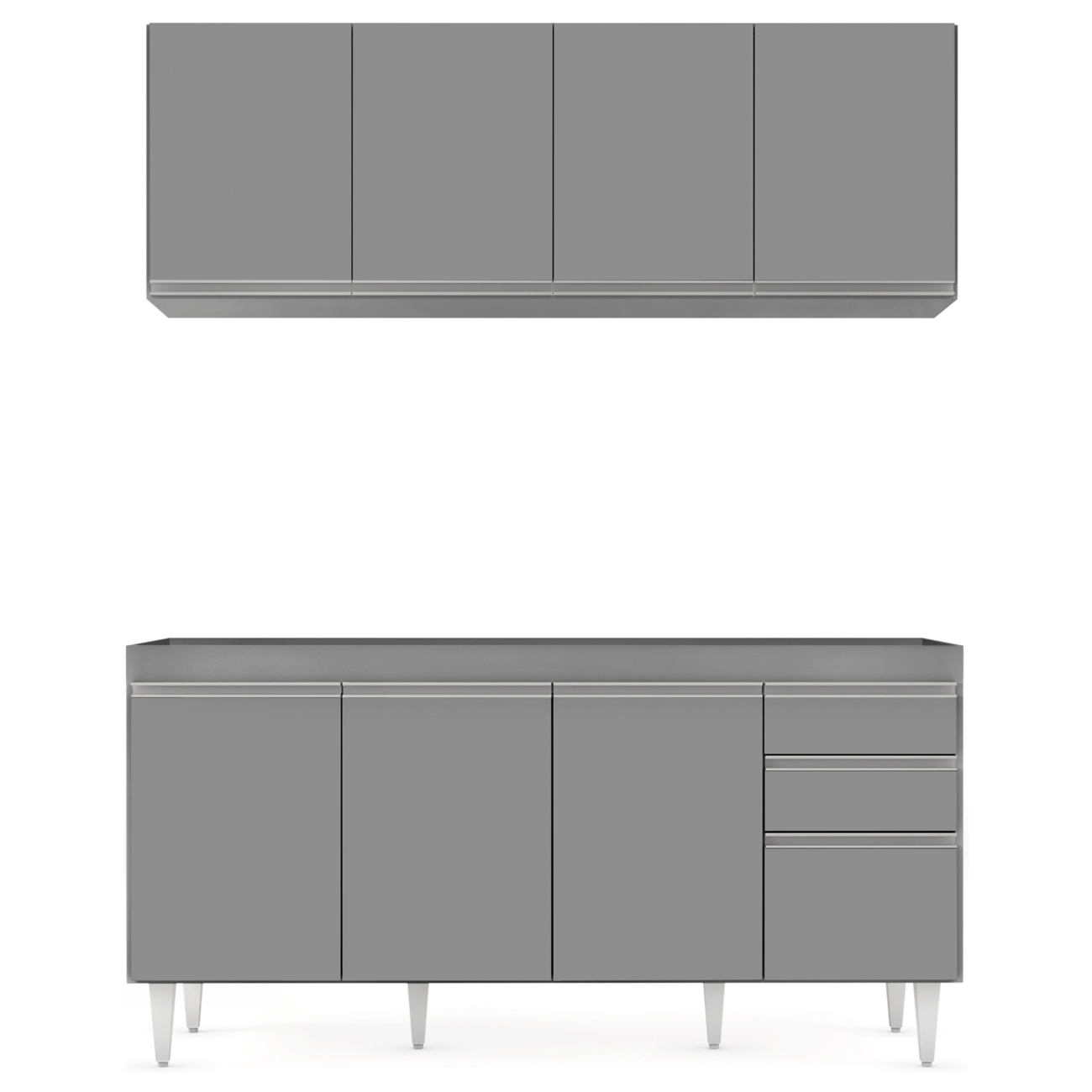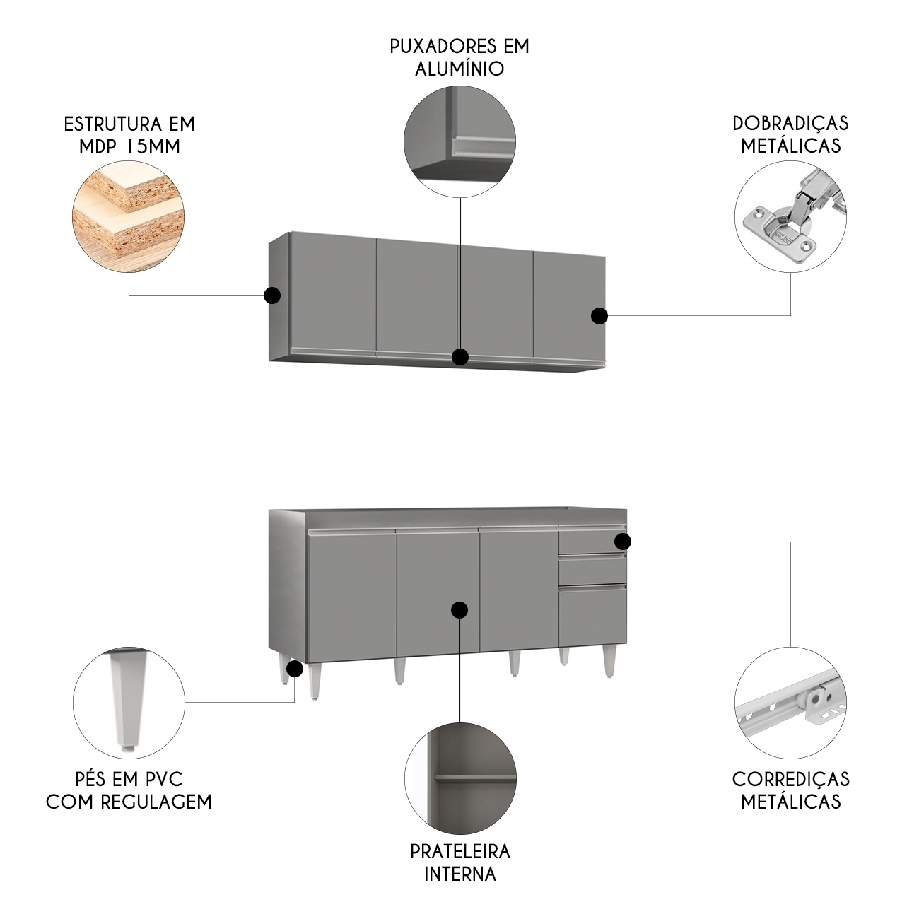 Produzido em MDP de alta resistência com pés em PVC e puxadores metálicos, apresenta estrutura firme e durável que valoriza o design contemporâneo da Cozinha.