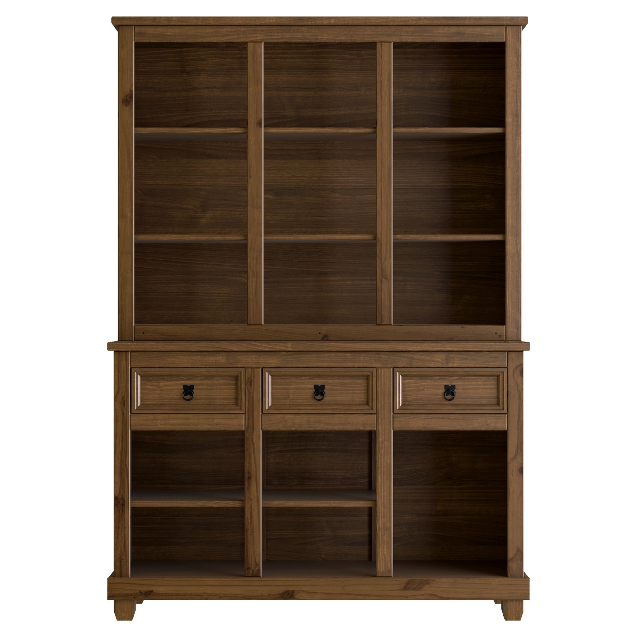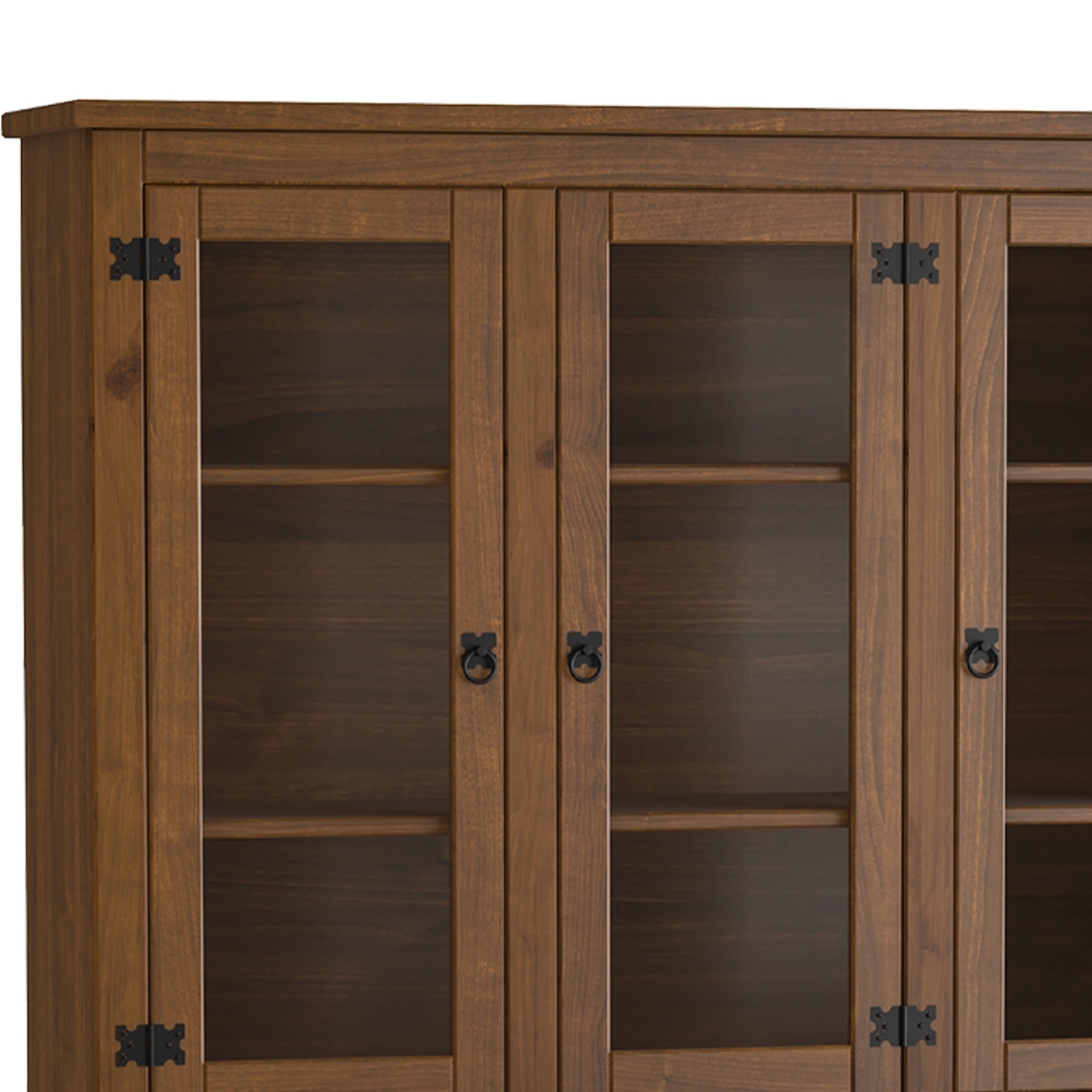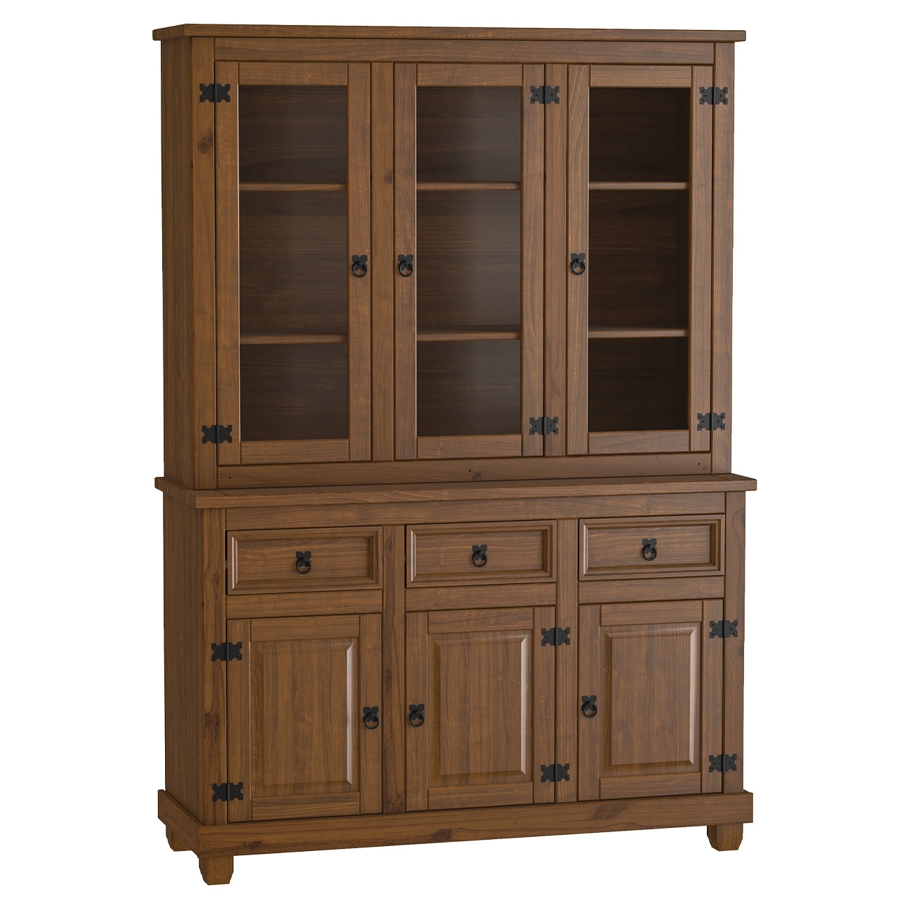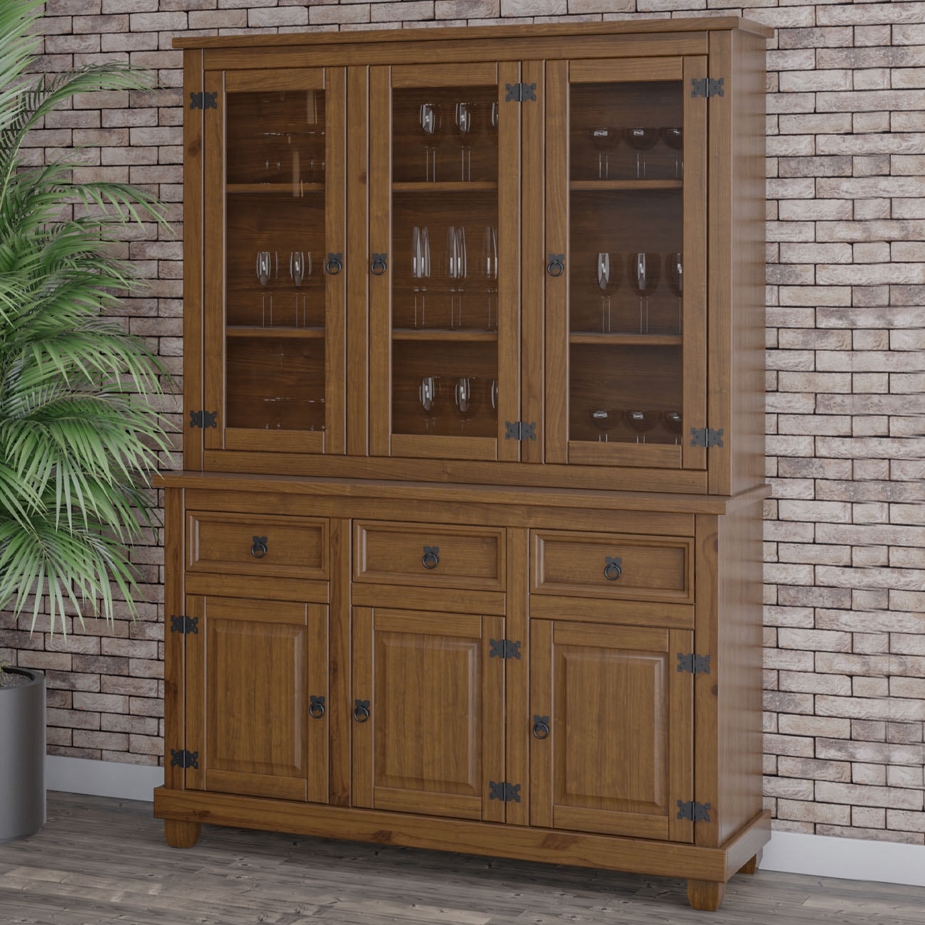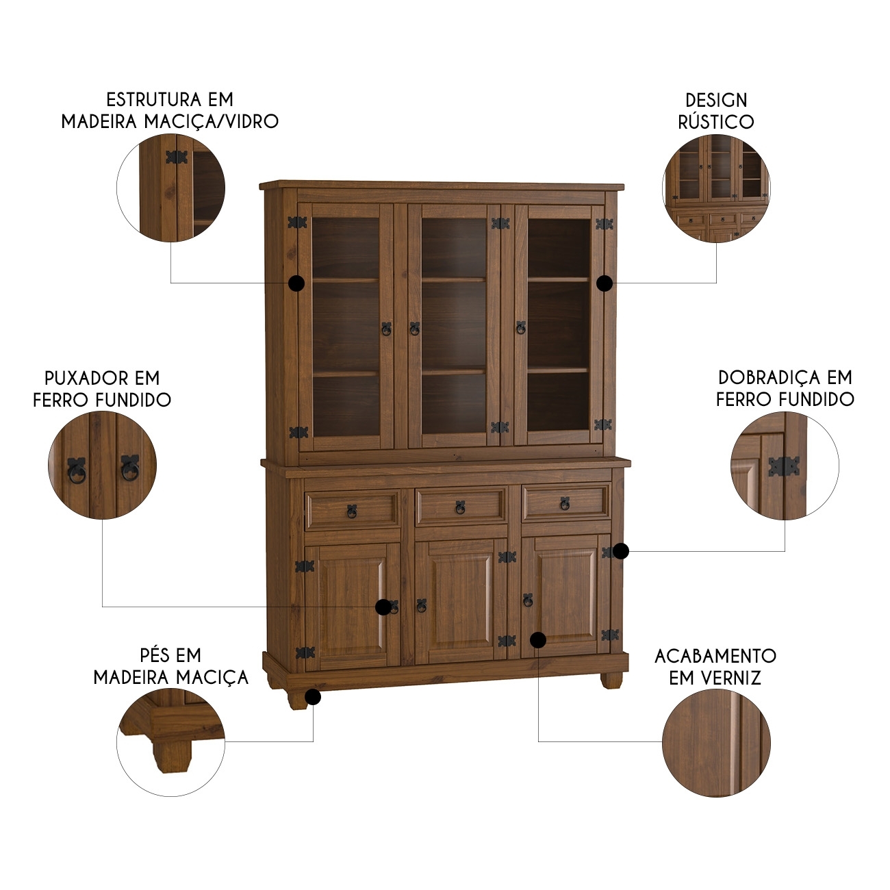 A estrutura em madeira maciça garante resistência e durabilidade, enquanto portas de vidro e madeira com detalhe almofada e puxadores em ferro fundido conferem autenticidade e estilo.