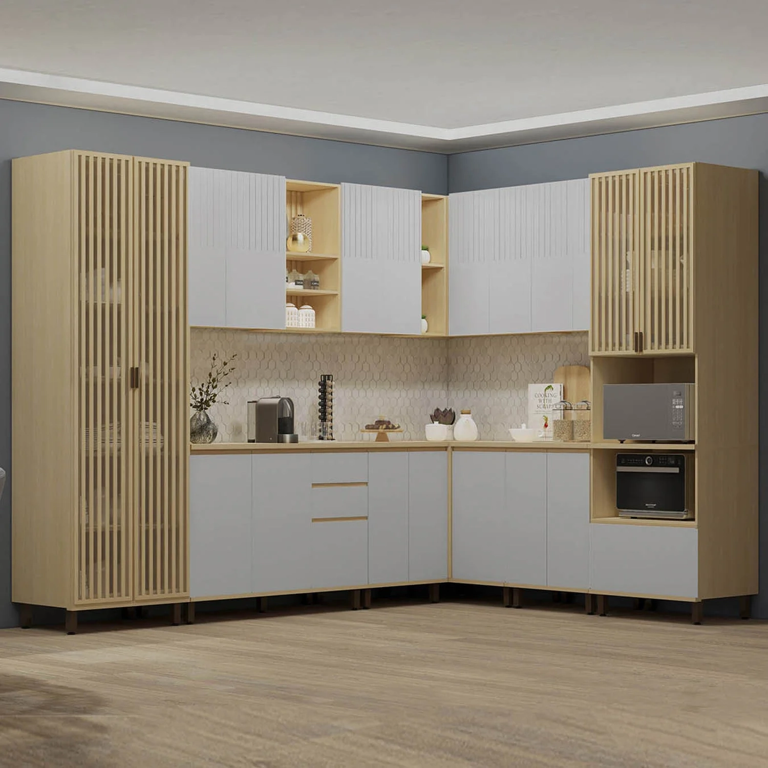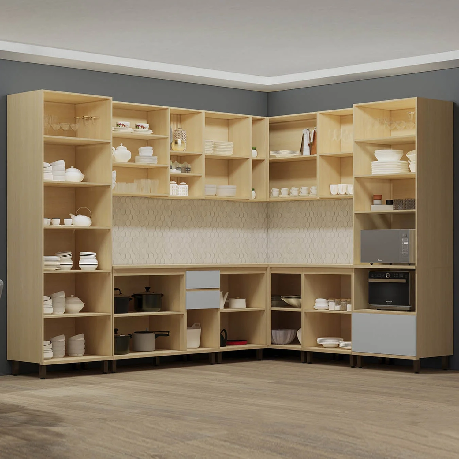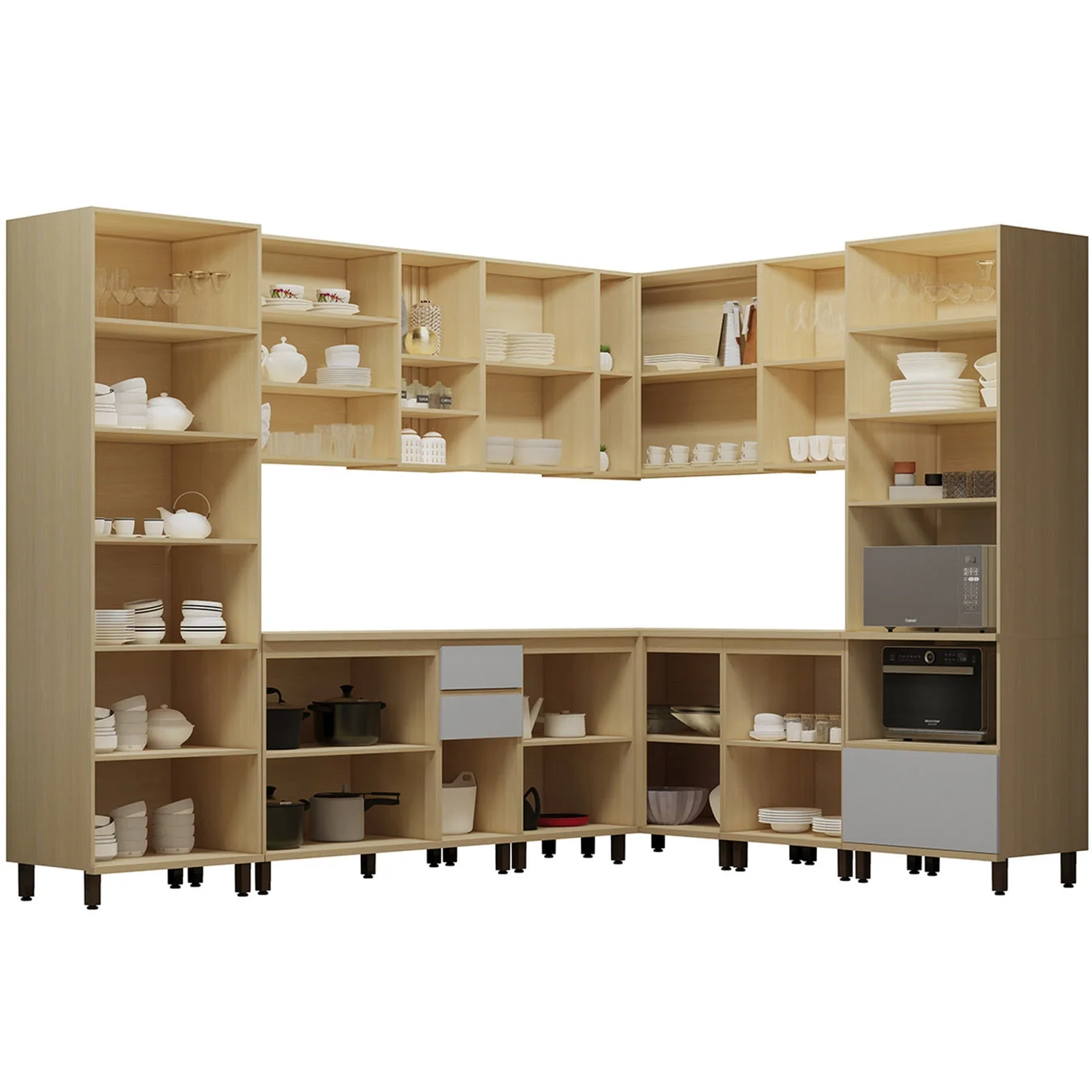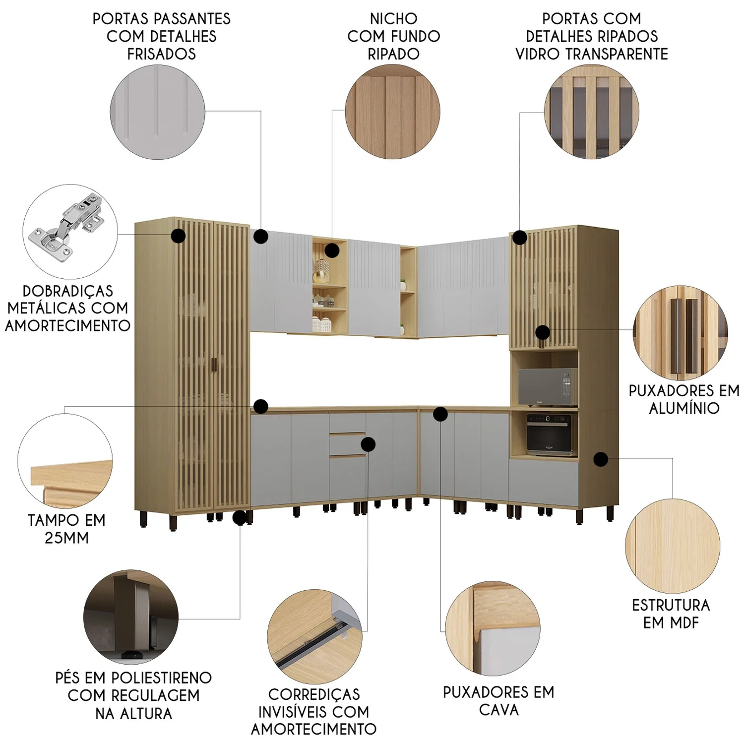 O Armário aéreo de 120cm tem duas portas, duas prateleiras internas e nichos com fundo ripado, agregando sofisticação ao ambiente. Além disso, o conjunto inclui dois Armários Aéreos de 60cm, com uma prateleira e duas portas, e um Armário Aéreo Canto Reto com duas portas e dois nichos, aproveitando bem os cantos da cozinha.