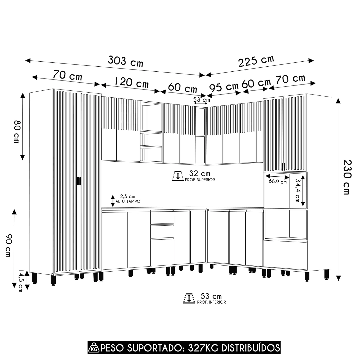 Peso Suportado Distribuído: Paneleiros 135kg/ Aéreos 76kg/ Balcões 101kg/ Tampo 15kg.