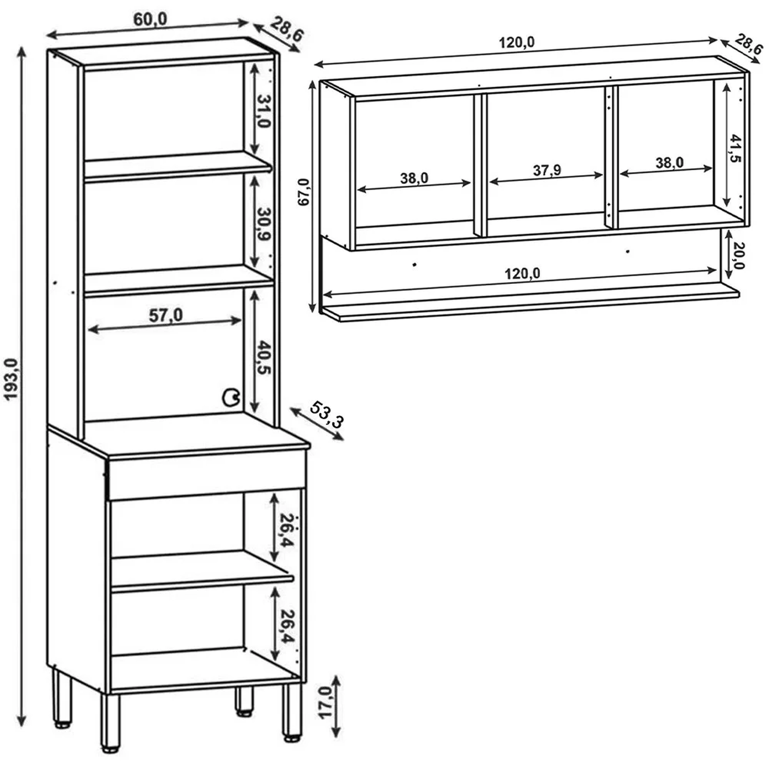 Armário Aéreo: 120 x 67 x 28,6 cm.