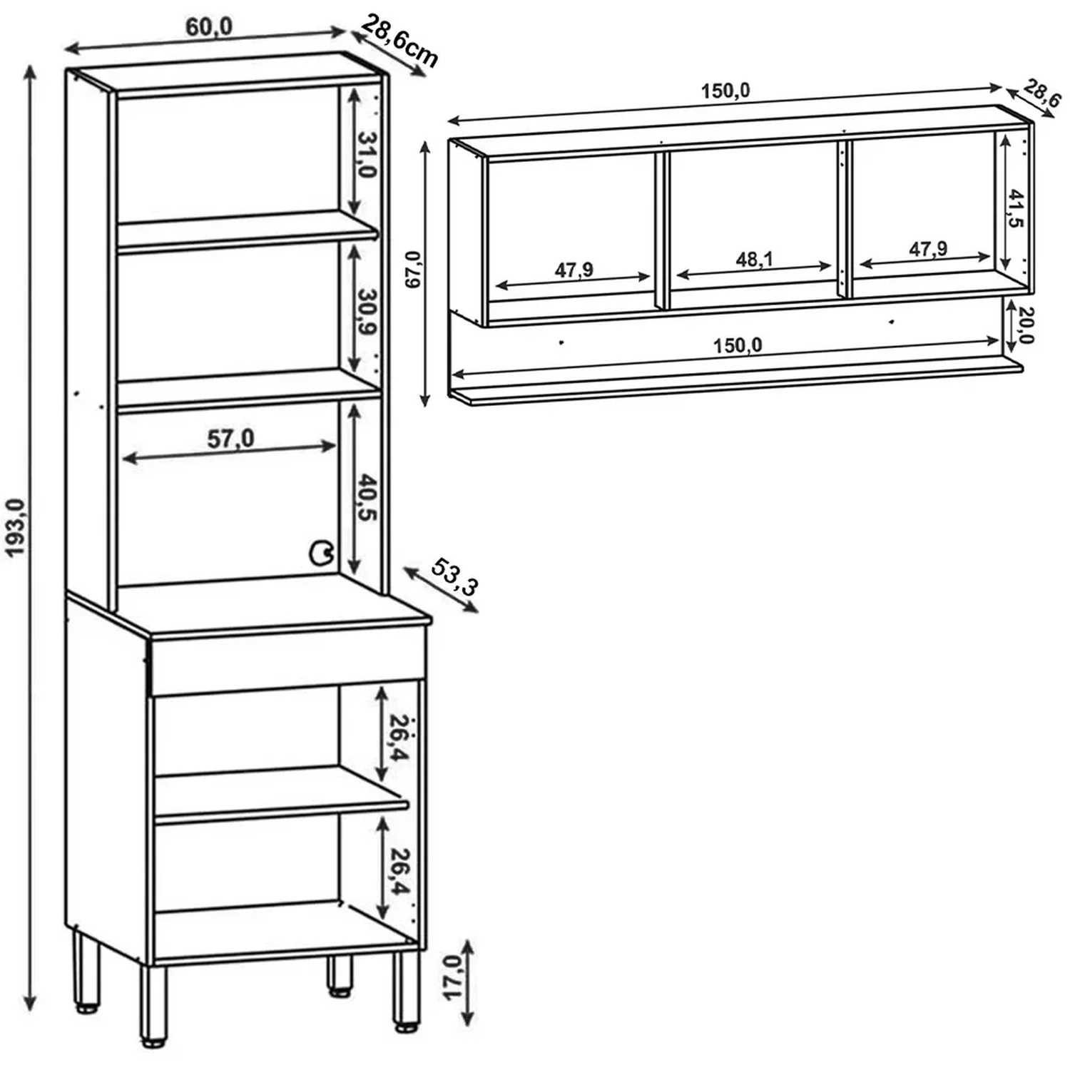 Armário Aéreo: 150 x 67 x 28,6 cm.
