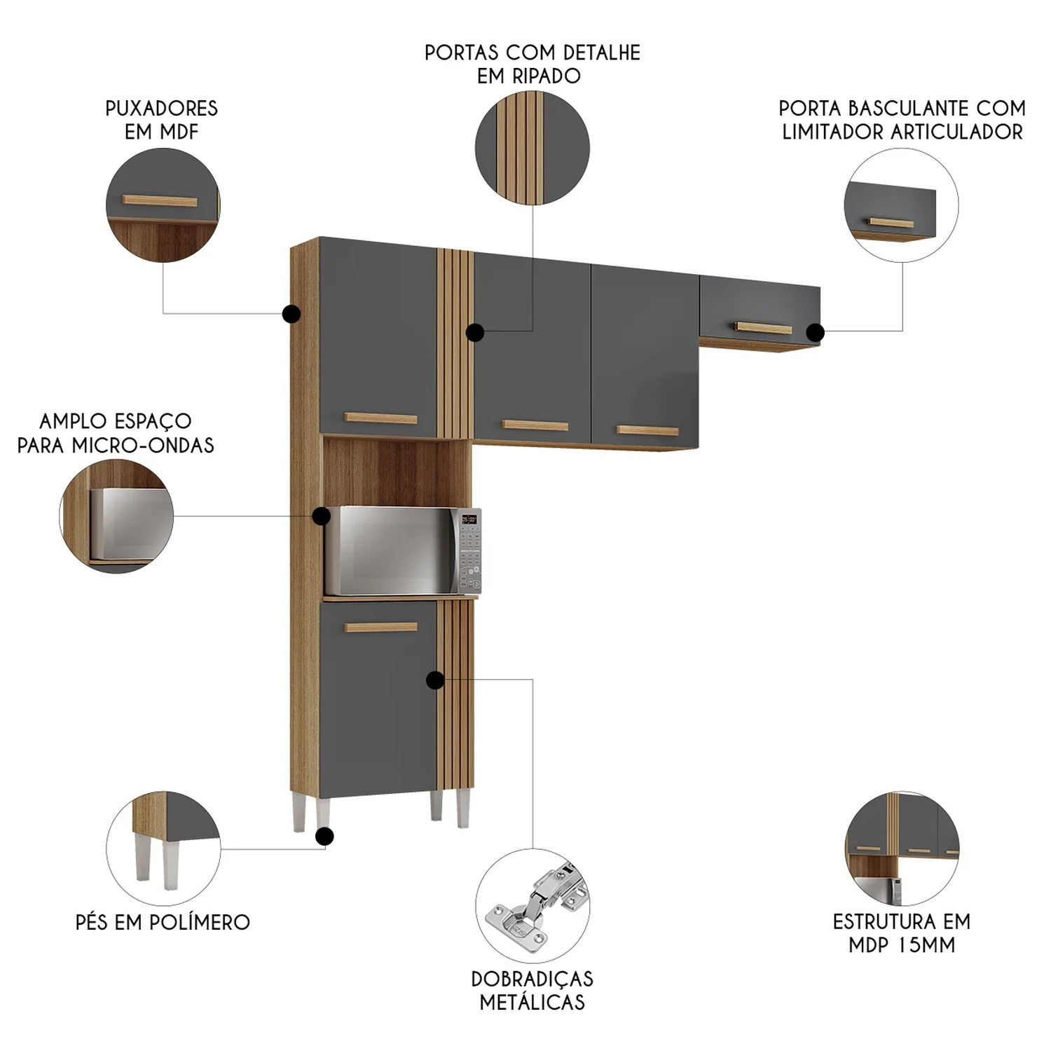 O Armário possui nicho para micro-ondas ou forno elétrico e detalhes que simulam ripado, trazendo charme e funcionalidade. Já o Balcão complementa com espaço interno amplo e acabamento refinado com tapa furos.