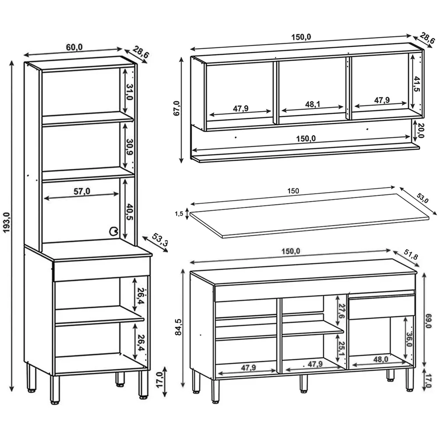 Conteúdo da Embalagem: 1 Balcão 150cm, 1 Armário Aéreo 150cm, 1 Paneleiro, 1 Tampo.