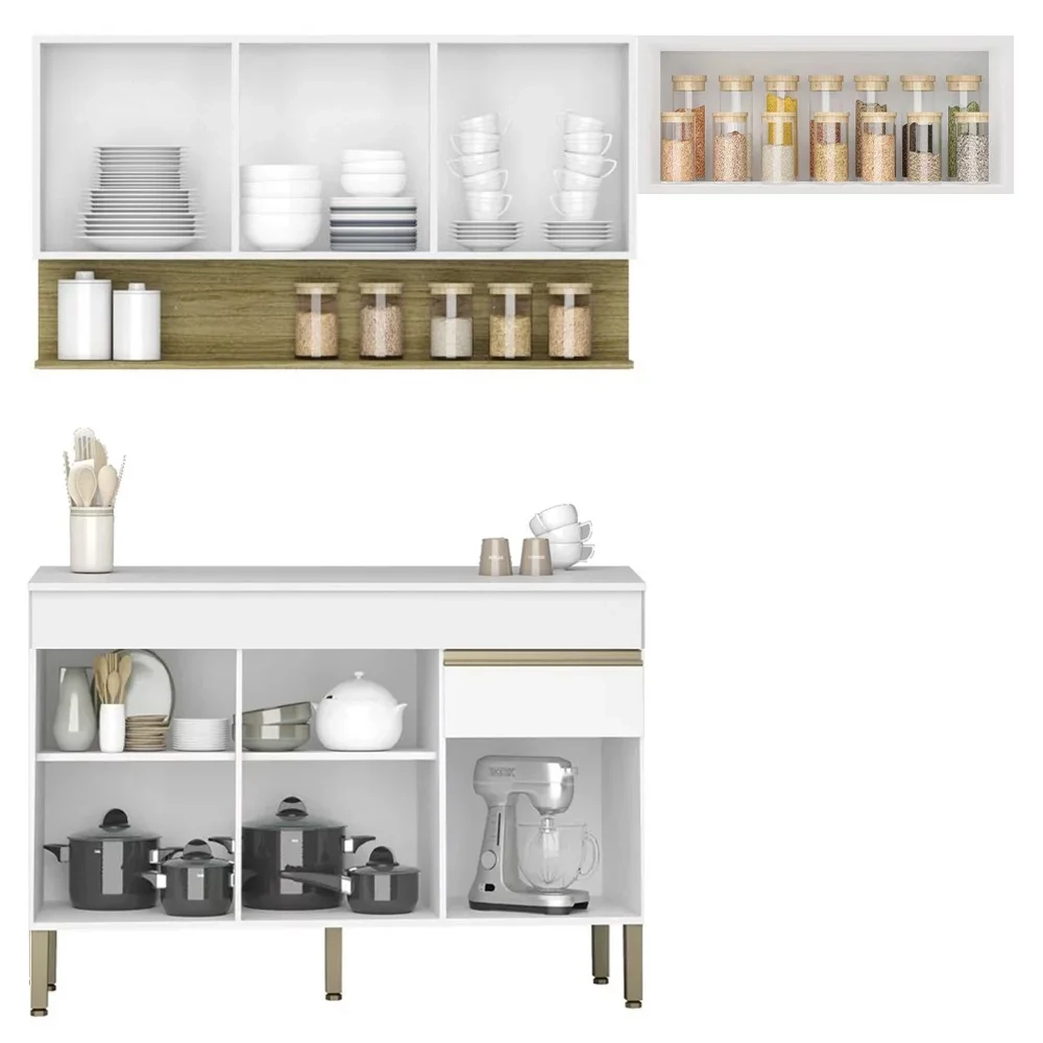 Conteúdo da Embalagem: 1 Balcão, 1 Armário Aéreo 150cm, 1 Armário Aéreo 70cm, 1 Tampo.