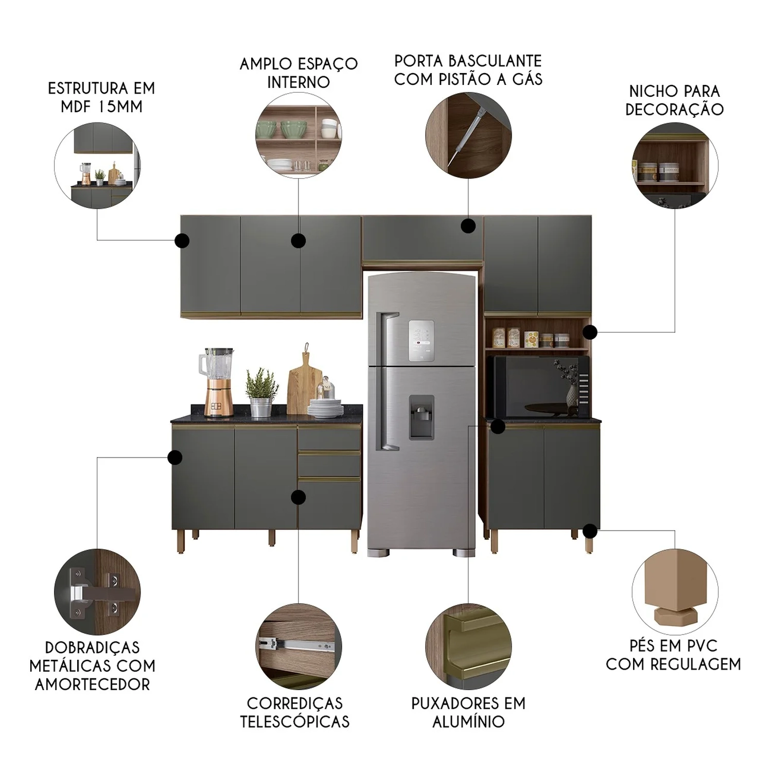 Com uma estrutura robusta em MDF de 15mm, este conjunto garante durabilidade e resistência. O acabamento em pintura UV confere um visual moderno e fácil de limpar, enquanto as dobradiças metálicas com amortecedores e os puxadores de alumínio proporcionam um fechamento suave e silencioso das portas. O Paneleiro Para Micro-Ondas, com quatro portas, oferece amplo espaço de armazenamento, além de nichos estrategicamente posicionados para eletrodomésticos e condimentos. O Armário Aéreo de 120cm, com três portas e uma prateleira interna, otimiza o espaço vertical, permitindo a organização eficiente da cozinha. O Balcão Para Pia de 120cm já com tampo, inclui duas portas e três gavetas com corrediças telescópicas, garantindo acesso fácil e organização dos utensílios. Os pés em PVC são ajustáveis, assegurando estabilidade em qualquer superfície. Por fim, o Armário Basculante aéreo de 80cm, com pistão a gás, reflete o cuidado na fabricação, promovendo um uso confortável e prolongando a vida útil do móvel. Este kit completo é a solução ideal para quem busca uma cozinha organizada, elegante e prática.