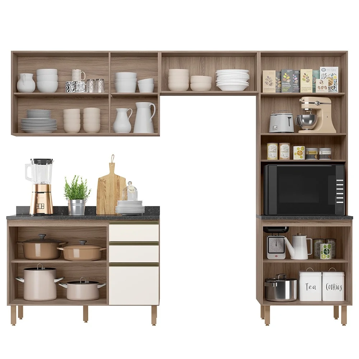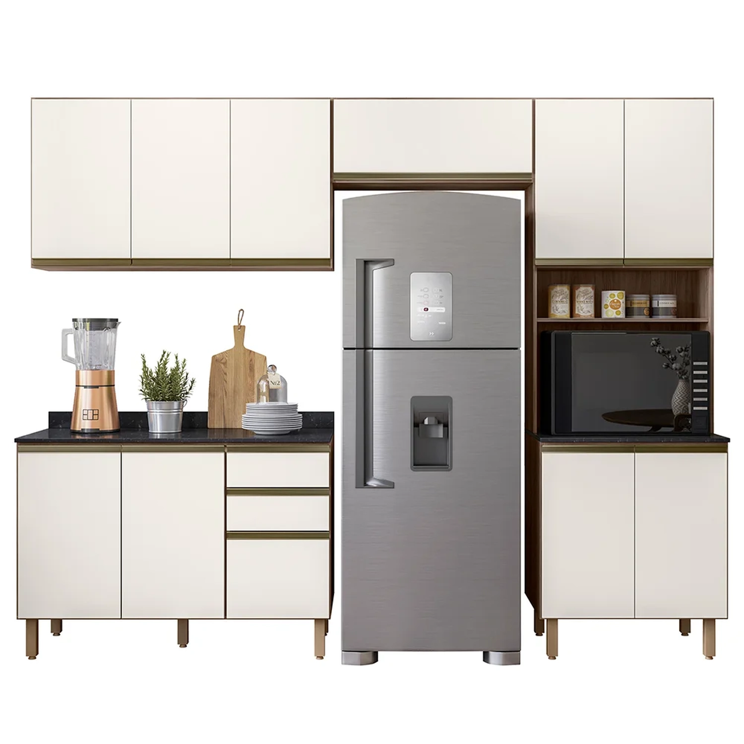 Conteúdo da Embalagem: 1 Balcão 120cm, 1 Armário Aéreo 120cm, 1 Armário Basculante, 1 Paneleiro, Tampo 120cm.