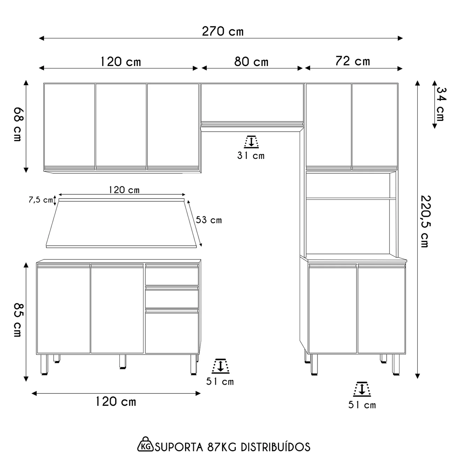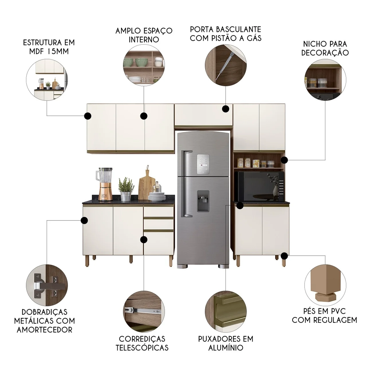 Com uma estrutura robusta em MDF de 15mm, este conjunto garante durabilidade e resistência. O acabamento em pintura UV confere um visual moderno e fácil de limpar, enquanto as dobradiças metálicas com amortecedores e os puxadores de alumínio proporcionam um fechamento suave e silencioso das portas. O Paneleiro Para Micro-Ondas, com quatro portas, oferece amplo espaço de armazenamento, além de nichos estrategicamente posicionados para eletrodomésticos e condimentos. O Armário Aéreo de 120cm, com três portas e uma prateleira interna, otimiza o espaço vertical, permitindo a organização eficiente da cozinha. O Balcão Para Pia de 120cm já com tampo, inclui duas portas e três gavetas com corrediças telescópicas, garantindo acesso fácil e organização dos utensílios. Os pés em PVC são ajustáveis, assegurando estabilidade em qualquer superfície. Por fim, o Armário Basculante aéreo de 80cm, com pistão a gás, reflete o cuidado na fabricação, promovendo um uso confortável e prolongando a vida útil do móvel. Este kit completo é a solução ideal para quem busca uma cozinha organizada, elegante e prática.
