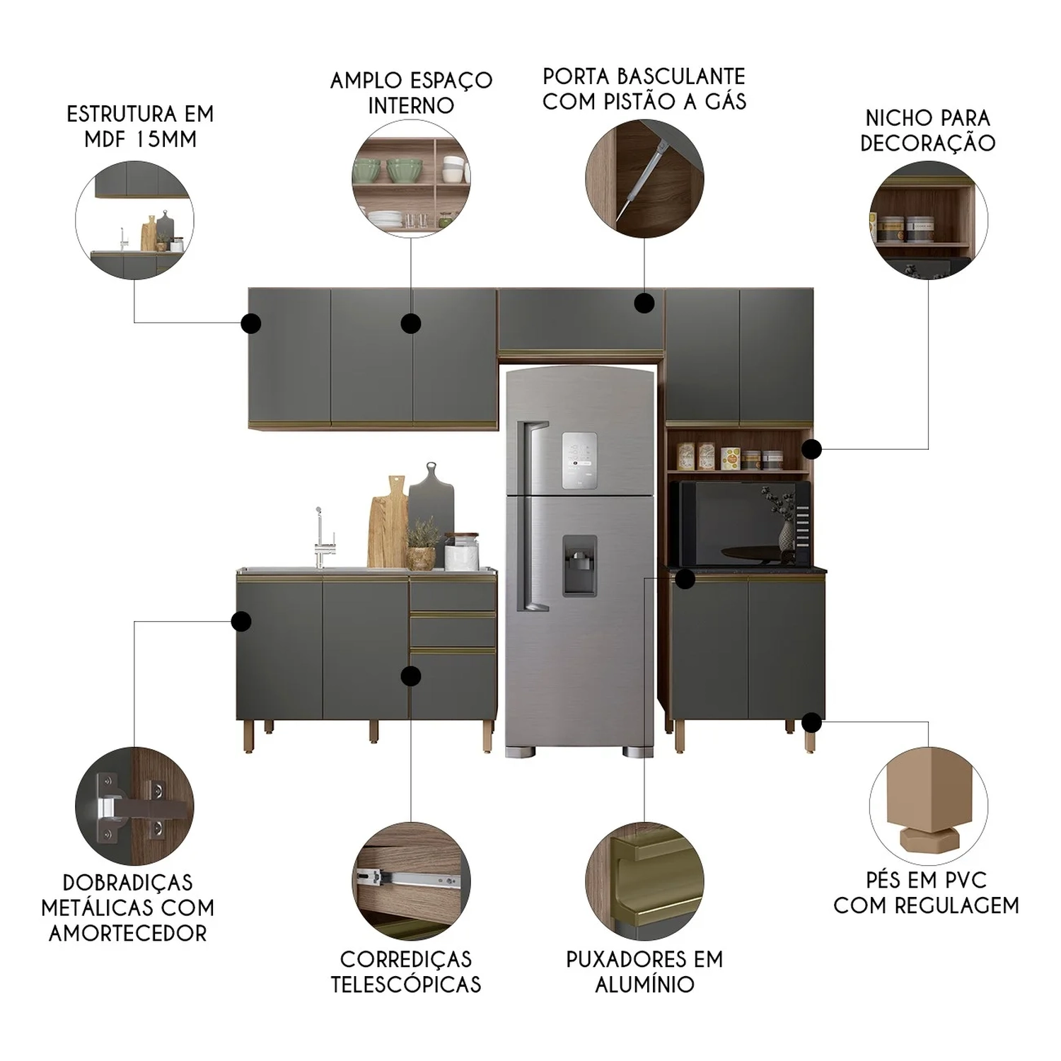 Com uma estrutura robusta em MDF de 15mm, este conjunto garante durabilidade e resistência. O acabamento em pintura UV confere um visual moderno e fácil de limpar, enquanto as dobradiças metálicas com amortecedores e os puxadores de alumínio proporcionam um fechamento suave e silencioso das portas. O Paneleiro Para Micro-Ondas, com quatro portas, oferece amplo espaço de armazenamento, além de nichos estrategicamente posicionados para eletrodomésticos e condimentos. O Armário Aéreo de 120cm, com três portas e uma prateleira interna, otimiza o espaço vertical, permitindo a organização eficiente da cozinha. O Balcão com Pia Inox de 120cm com cuba e válvula, inclui duas portas e três gavetas com corrediças telescópicas, garantindo acesso fácil e organização dos utensílios. Os pés em PVC são ajustáveis, assegurando estabilidade em qualquer superfície. Por fim, o Armário Basculante aéreo de 80cm, com pistão a gás, reflete o cuidado na fabricação, promovendo um uso confortável e prolongando a vida útil do móvel. Este kit completo é a solução ideal para quem busca uma cozinha organizada, elegante e prática.