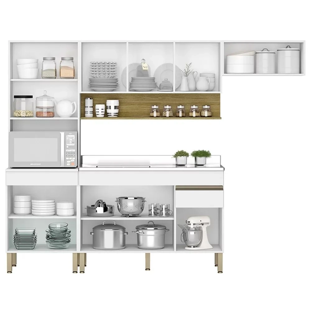 A Cozinha Modulada é composta por um armário aéreo de três portas com nicho para colocar objetos decorativos, um armário aéreo 70cm, um gabinete com 3 portas e 1 gaveta com corrediças metálicas, puxadores em alumínio e prateleira interna para manter seus utensílios de cozinha organizados e um paneleiro Torre Quente tem 2 portas, prateleiras internas e nicho para micro-ondas. Todos os móveis são feitos de MDP de alta qualidade, com acabamento em pintura UV que protege contra riscos e desgastes. O Gabinete para Pia tem espaço para armazenar panelas, louças, talheres e outros itens, ele acompanha também Pia Inox com cuba e válvula. O design é moderno e clean, com cores que ampliam o ambiente. A montagem é rápida, e você pode escolher a disposição que mais se adapta ao seu espaço.