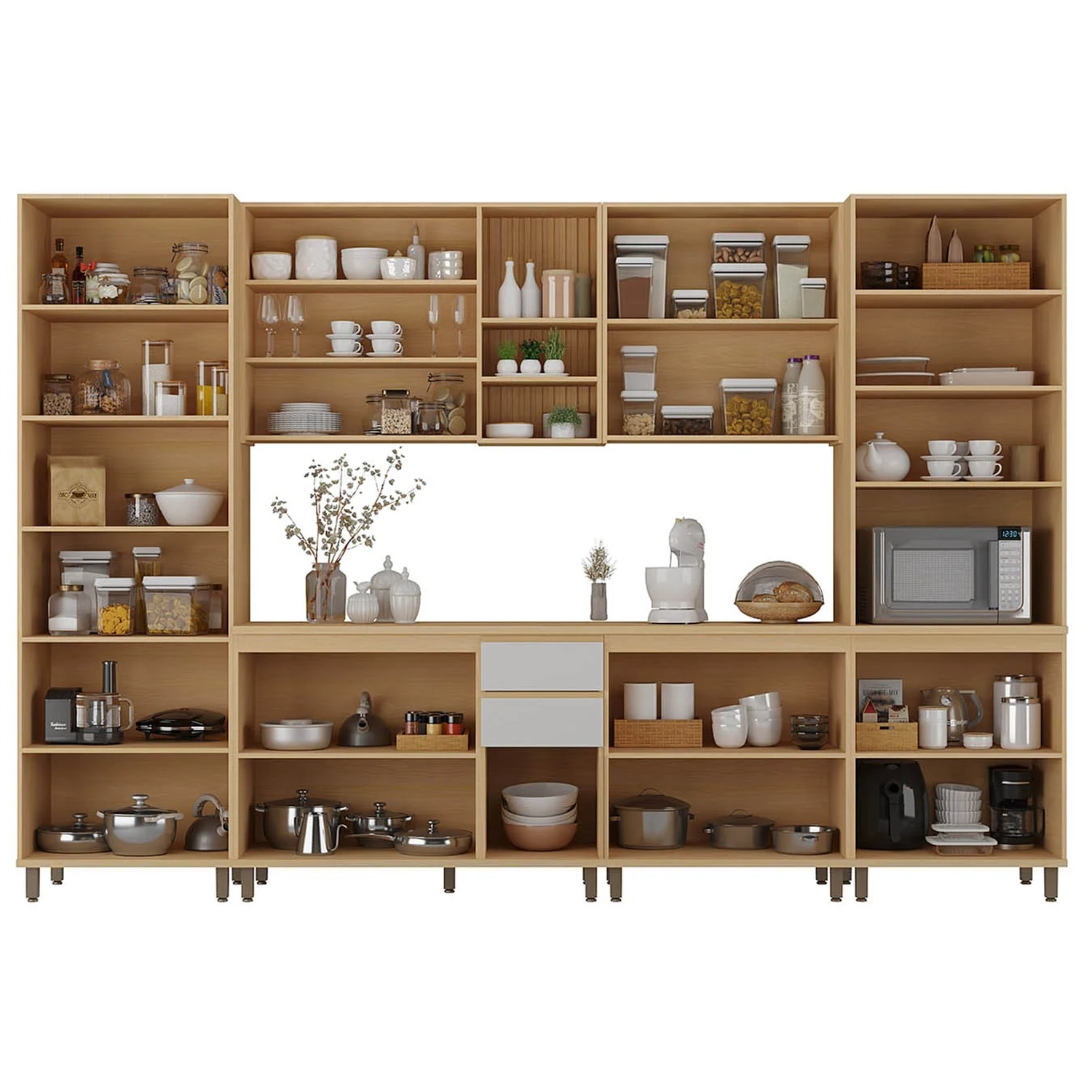 Conteúdo da Embalagem: 1 Paneleiro Cristaleira, 1 Paneleiro Micro-ondas, 1 Aéreo 80cm, 1 Aéreo 120cm, 1 Balcão 80cm, 1 Balcão 120cm, 1 Tampo.