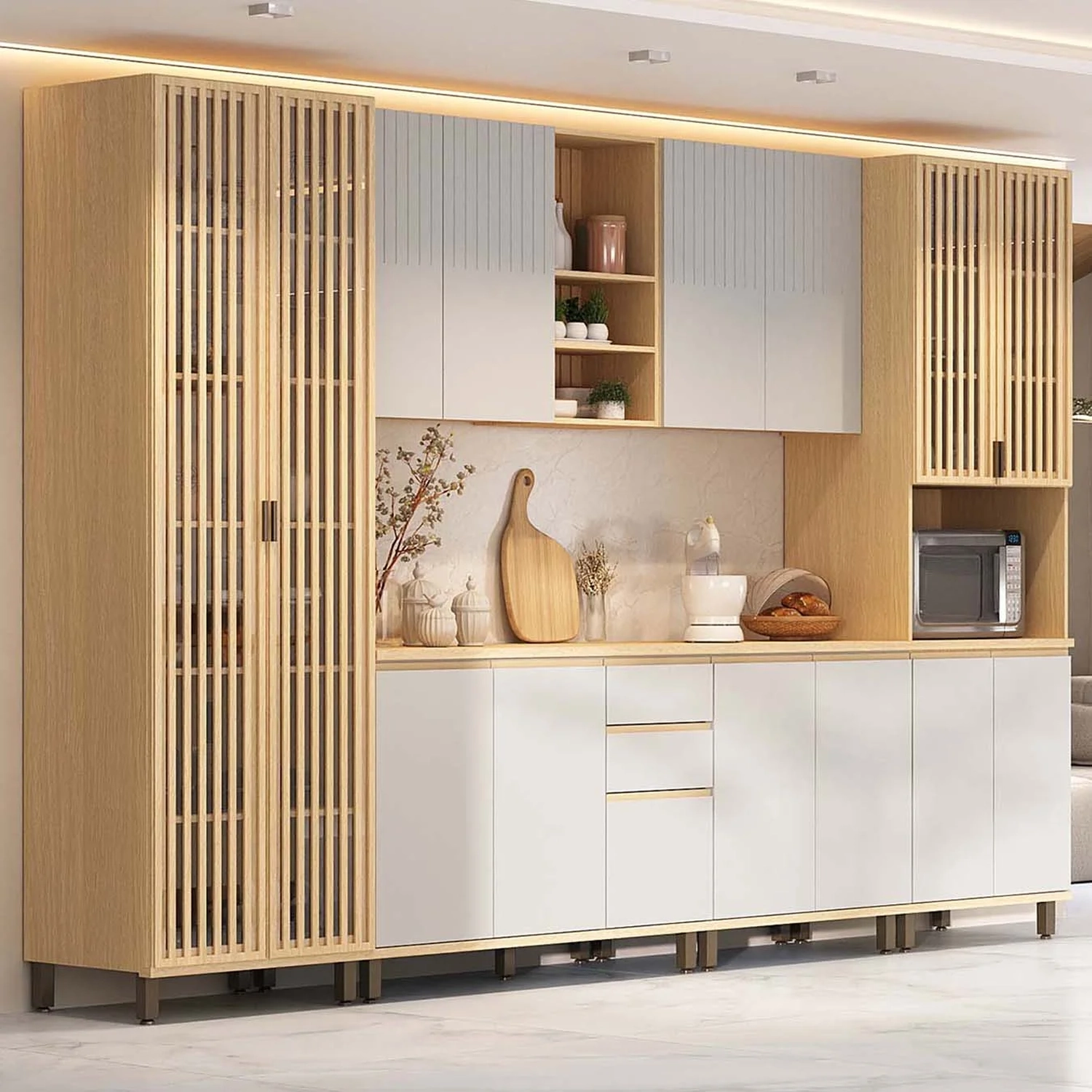 O Paneleiro de Cozinha tipo cristaleira conta com duas portas ripadas de vidro e prateleiras internas, proporcionando amplo espaço para armazenamento e um visual elegante. O Paneleiro de Cozinha Micro-ondas possui nicho específico para o micro-ondas, mantendo a cozinha organizada e moderna, também com portas ripadas de vidro e prateleiras.