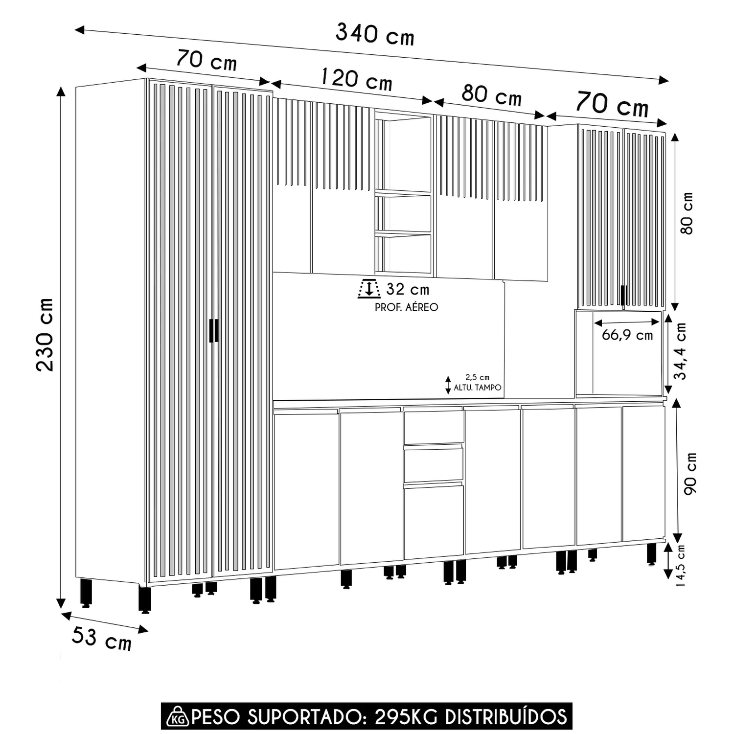 Paneleiro Micro-ondas: 70 cm x 230 cm x 53 cm.