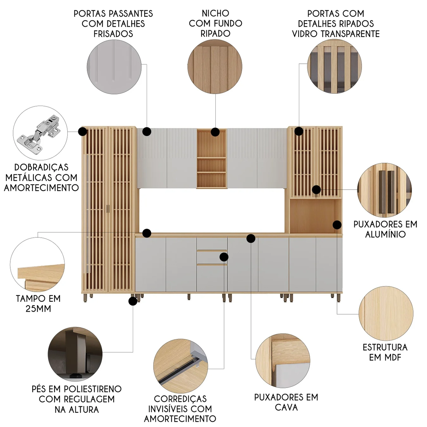 Todos os móveis apresentam acabamentos que garantem durabilidade e estilo a sua Cozinha. As portas possuem dobradiças metálicas com sistema de amortecimento, e os aéreos têm frisos elegantes. As gavetas possuem corrediças invisíveis com amortecimento, que além de garantir um deslizar suave, valoriza ainda mais o móvel. Além disso, os paneleiros e balcões possuem pés reguláveis, garantindo maior estabilidade.
