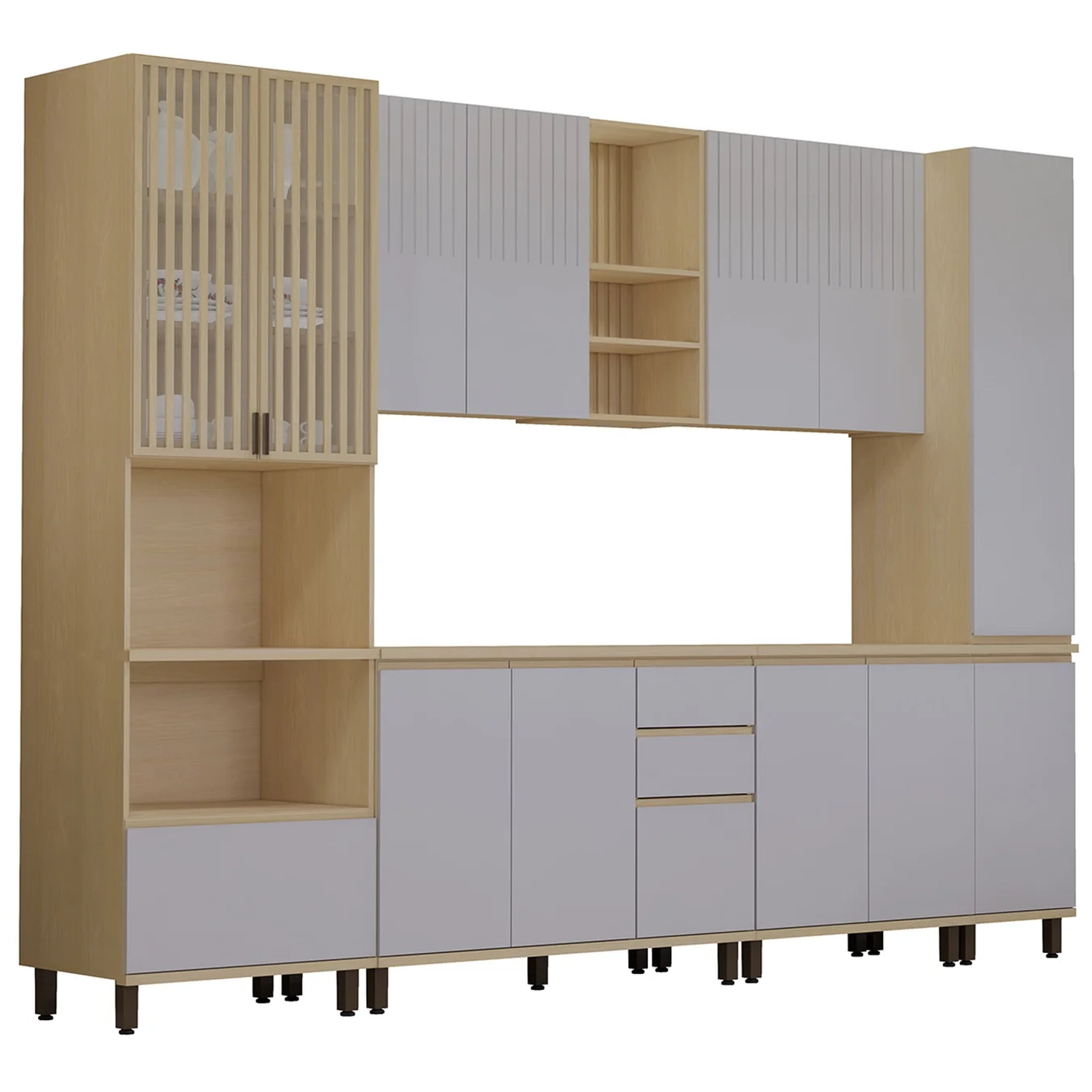 O Armário Aéreo de 120cm oferece duas portas, duas prateleiras internas e nichos com fundo ripado, agregando sofisticação ao ambiente. O Armário de Cozinha Aéreo de 80cm tem duas portas e uma prateleira.