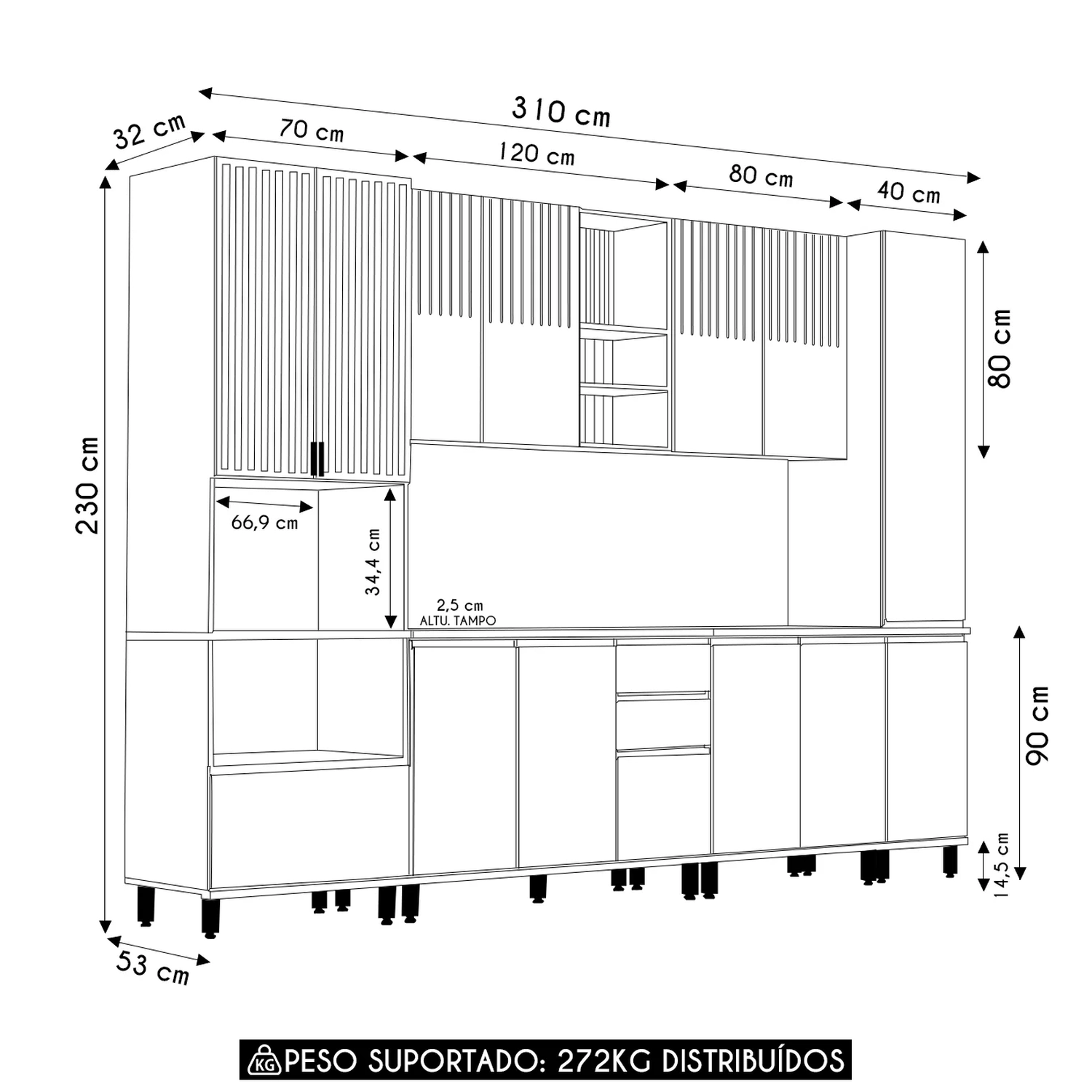 Peso Suportado Distribuído: Paneleiros 112kg/ Aéreos 71kg/ Balcões 74kg/ Tampo 15kg.