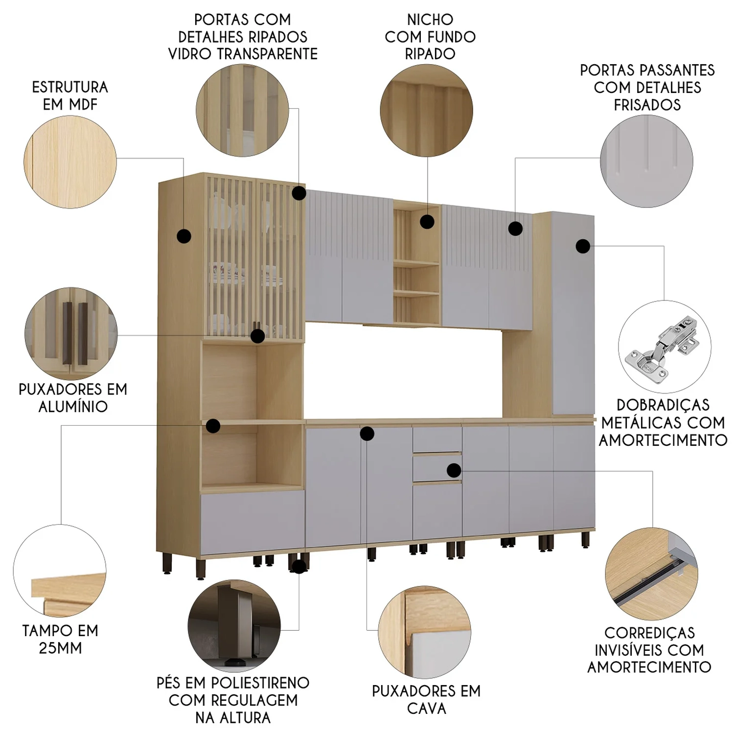 As gavetas possuem corrediças invisíveis com amortecimento, garantindo um deslizar suave e maior resistência. As portas têm dobradiças metálicas com sistema de amortecimento, proporcionando um fechamento suave e silencioso.