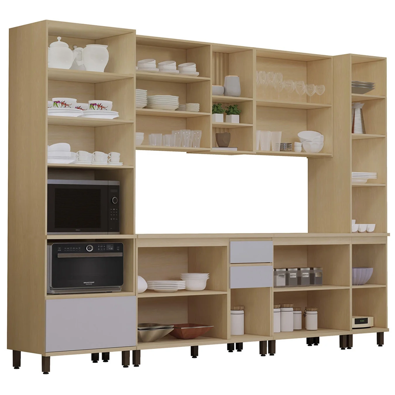 Conteúdo da Embalagem: 1 Paneleiro Torre Quente liso, 1 Aéreo 120cm, 1 Aéreo de 80cm, 1 Paneleiro Simples, 1 Balcão 80cm, 1 Balcão 120cm, 1 Tampo.